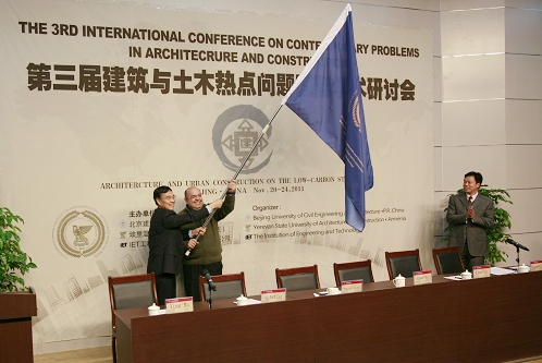 接着北京建筑工程学院校长郑文堂向亚美尼亚埃里温国立建筑大学校长Tockmadjyan交接了建筑与土木热点问题国际学术研讨会会旗。