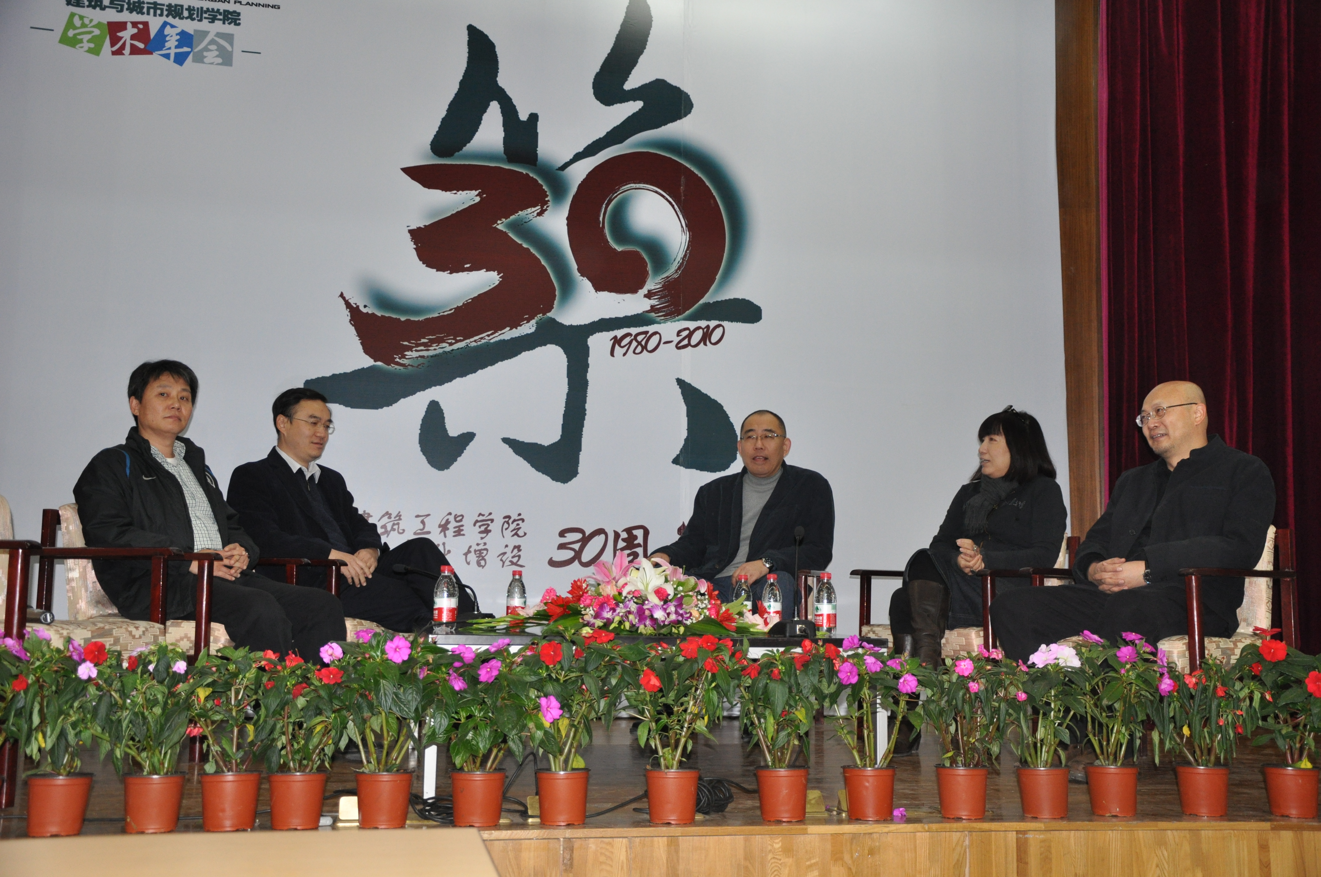 围绕主持人“总结近三十年建筑行业的发展变化,并对今后的发展做出一些畅想。”、“从刚踏出校门的毕业生到成为知名的建筑师的过程中,最重要的转折点是什么?”、“大学生在校期间必须掌握的知识和技能。”、“目前大型设计单位、设计公司选人、用人方面,本科生和研究生根本的差别在哪里?”、“至少要积累几年工作经验才能进行真正的建筑创作?是不是刚参加工作都是画图匠?”等问题,五位校友结合各自的人生、事业奋斗历程做了精彩的回答和详尽的介绍,并对建筑教育和同学们以后走向社会工作提出了若干建议,其中特别指出同学们应该清楚自己的理想和目标,依据时代的变化,对自身有一个清晰的定位,同学之间要相互学习,作为个人应踏踏实实地努力工作。
