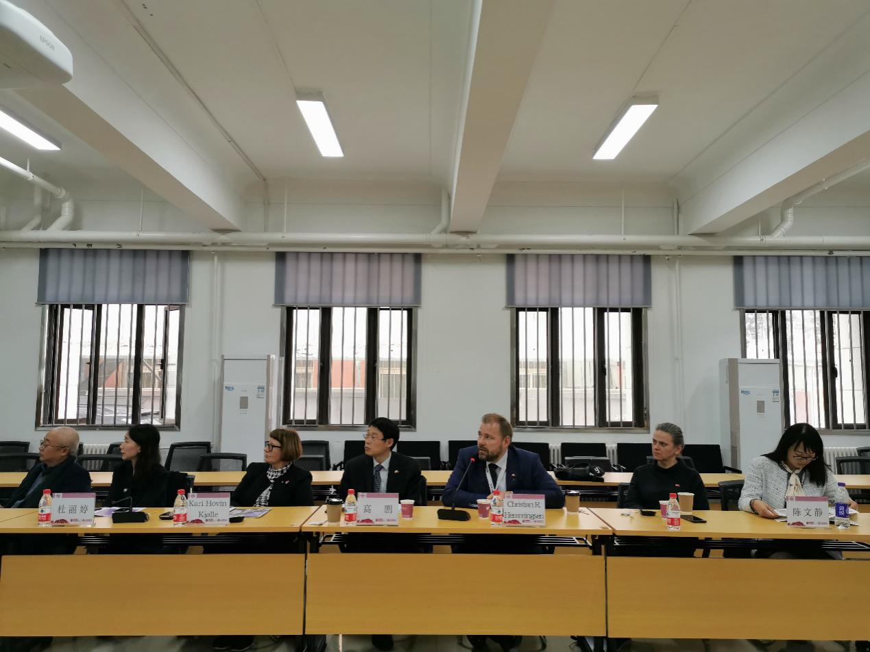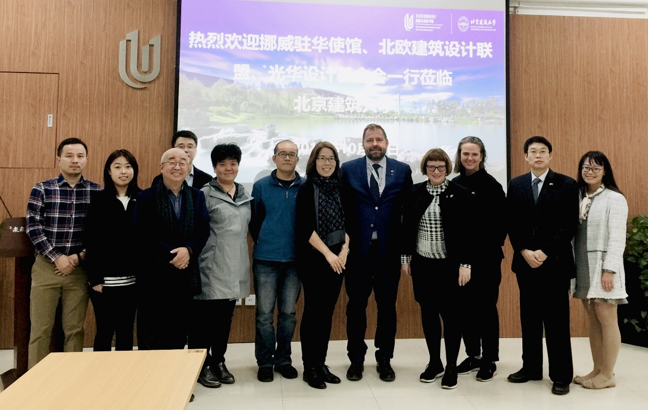 在科技服务业专班重大专项和中挪绿色创新中心筹备建立的背景下,2019年10月19日下午,挪威驻华使馆高级商务官员高鹏博士,北欧建筑设计联盟执行主席、建筑设计师Christian R. Hemmingsen先生,挪威安博公司经理/设计师Kari Hovin Kj?lle女士,景观设计师陈文静女士,挪威法贝尔建筑设计事务所董事长、建筑设计师Margrethe Maisey女士,光华设计基金会理事长张琦和杜丽婷女士,来访我校努努影视 与未来城市设计高精尖创新中心,双方代表在西城校区科研楼110会议室进行了热烈的科研与教学合作交流。努努影视 副院长欧阳文、院长助理潘剑彬、建筑系主任郝晓赛、副系主任丁光辉、历史建筑保护系副主任杨一帆、外事秘书何静涵和高精尖创新中心办公室科长肖冰出席了座谈会。