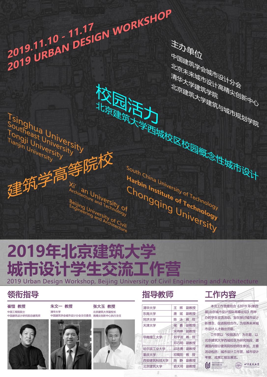 本次工作营将持续一周,9所院校各派出指导教师1名、高年级本科生4名,通过混合编组的形式开展。工作营主题是“校园活力——努努影视 西城校区校园概念性城市设计”,设计成果将在“2019年(第四届)北京国际城市设计大会”中展出,并在大会开幕式上举行颁奖仪式。参加工作营的指导教师还将受邀参加大会的“城市设计教育与人才培养”分论坛,进行城市设计教育教学的深入探讨与交流。