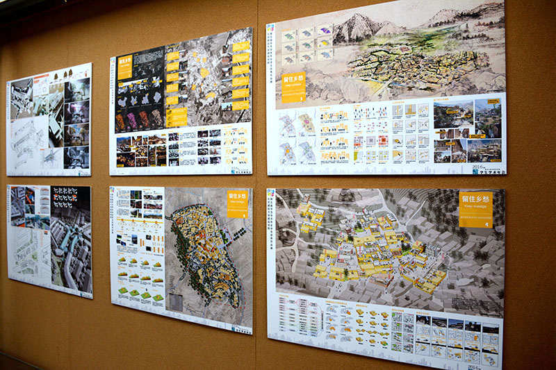 此次展览的学生作品涉及范围广阔,其中包括公共场所更新、地块研究设计、入口设计展馆设计、环境整治、四合院改造,城市规划等不同方面的研究。研究内容涉猎材料、结构,用途,文化,活力,设施,艺术,景观等。城市规划项目还对建设宜游,宜商,宜居,宜展城市进行调研与总结。图纸上附有渲染图、模型照片、复原图及文字介绍。