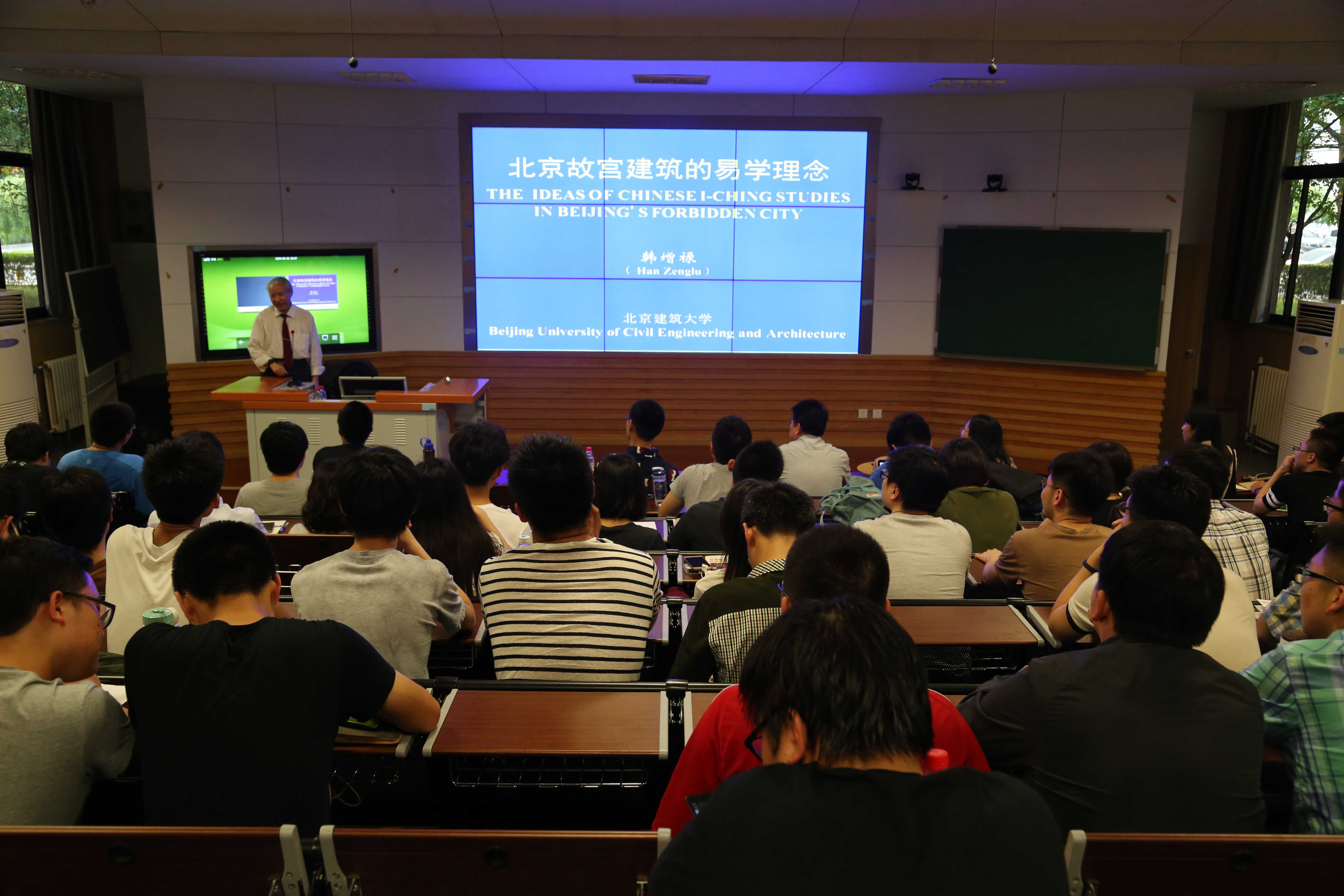 在讲述过程中,韩教授以易学理念物化于建筑上的方式为例,提出崇尚和谐的中国建筑易学理念通过方位、造型、图像、颜色、数字、文字六种方式体现,同时以北京明、清紫禁城为例,细说其中易学奥秘,并指出“中国建筑所追求的最高境界,就是易学哲学中的‘天人合一’”。