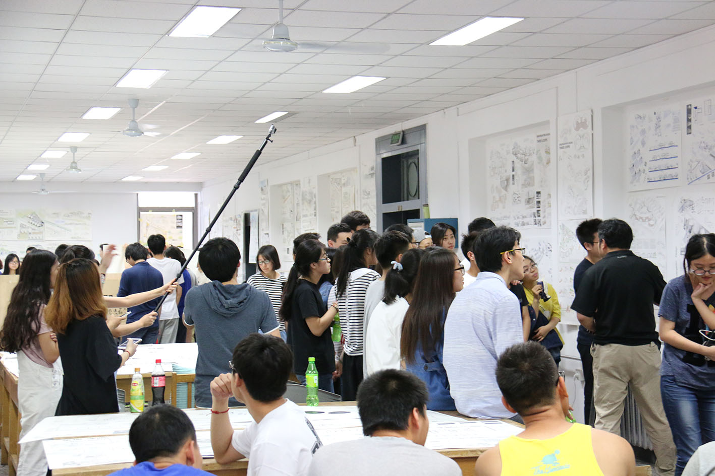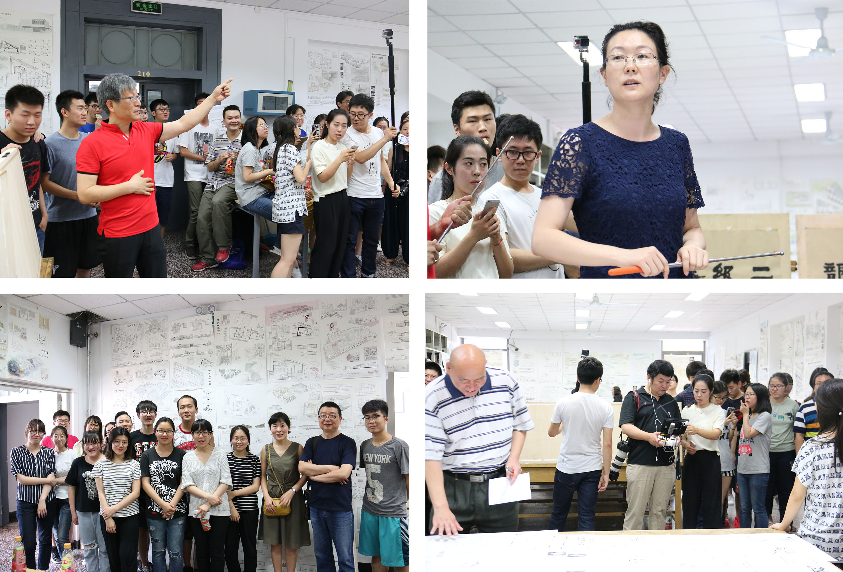 为了更好的记录建院学子的作业成果,提高评图的效率,学院特别组织三位研究生操作航拍飞机、gopro4、Mark111等设备,使用无人航拍技术,全方位立体的展现建院学子的手绘成果、钢笔排线、水彩渲染、喷笔绘图、3D打印等作业效果,师生互动频繁,现场气氛十分热烈。