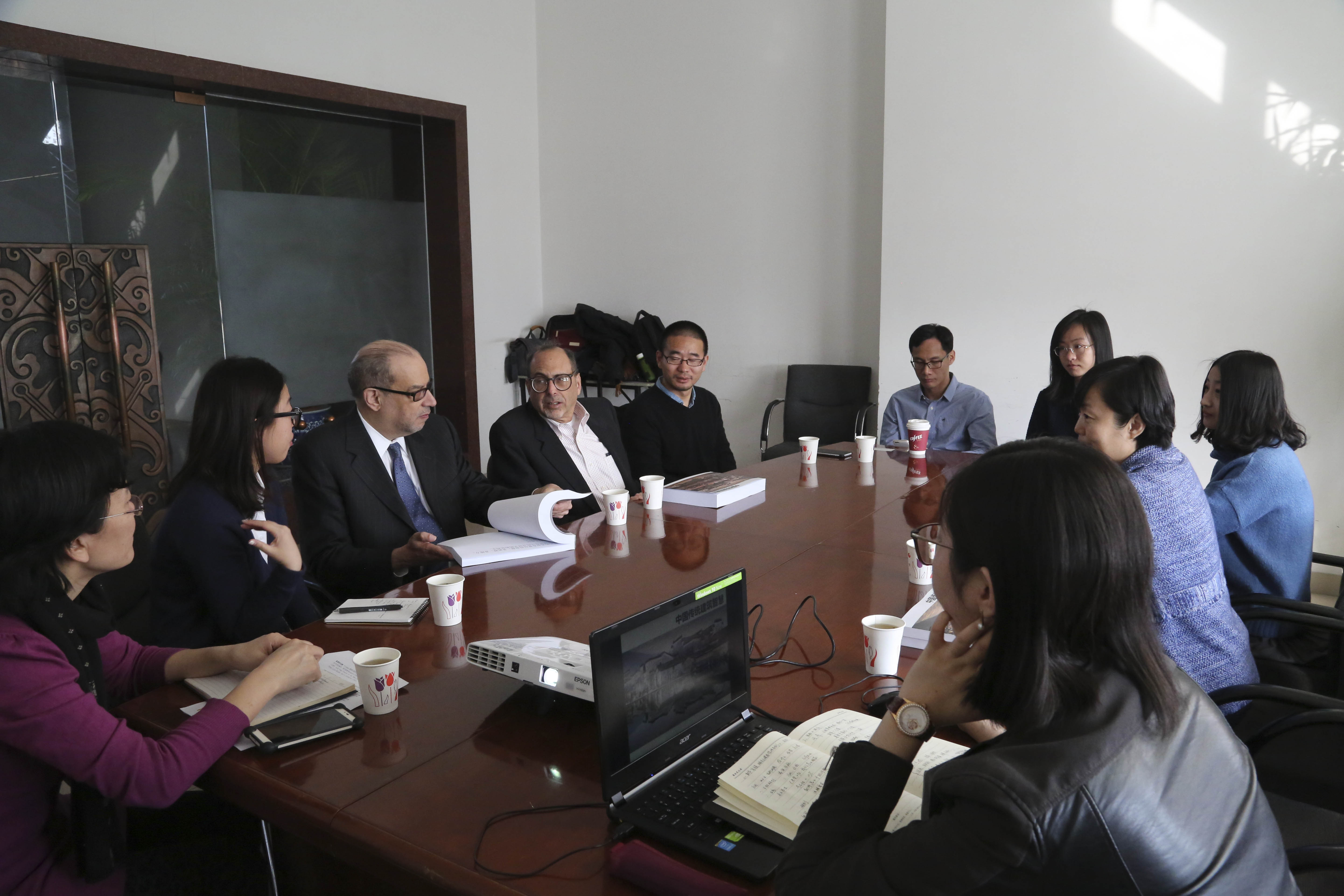 林处长介绍了住建部组织开展的“中国传统建筑智慧”宣传片拍摄项目的研究背景与研究内容,阐明了当前这项工作在国内外历史文化传承中的重要意义。2017年2月6日,中共中央办公厅、国务院办公厅印发《关于实施中华优秀传统文化传承发展工程的意见》,这一文件对当前中国文化建设提出了目标和要求,掀起了全国传承中华优秀传统文化的新热潮。“中国传统建筑智慧”宣传片的建设方向及研究思路与该文件精神高度契合,是实践文件内容与要求的有效研究工作。林处长请两位美国教授就目前的研究大纲提了宝贵建议,同时也请他们表达了自己对中国传统建筑的认识和理解。最后,Roy Strickland教授介绍了美国的历史地标建筑保护体系与管理委员会的设置与运行情况,Robert Fishman教授讲解了中国传统建筑在世界建筑历史之林的重要地位和美国乡村风貌保护的内容,这些宝贵经验都有利于我国的传统建筑解析和传统村落保护工作的健康推进。