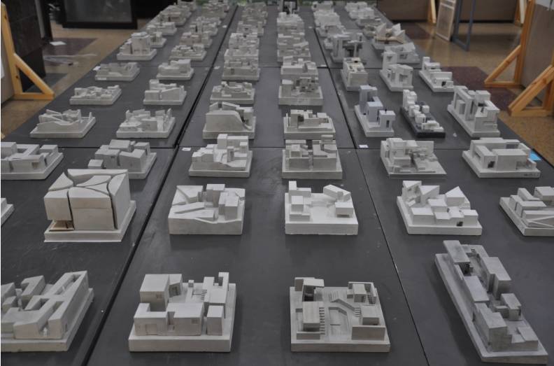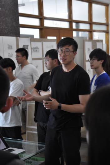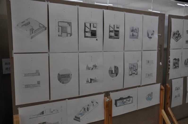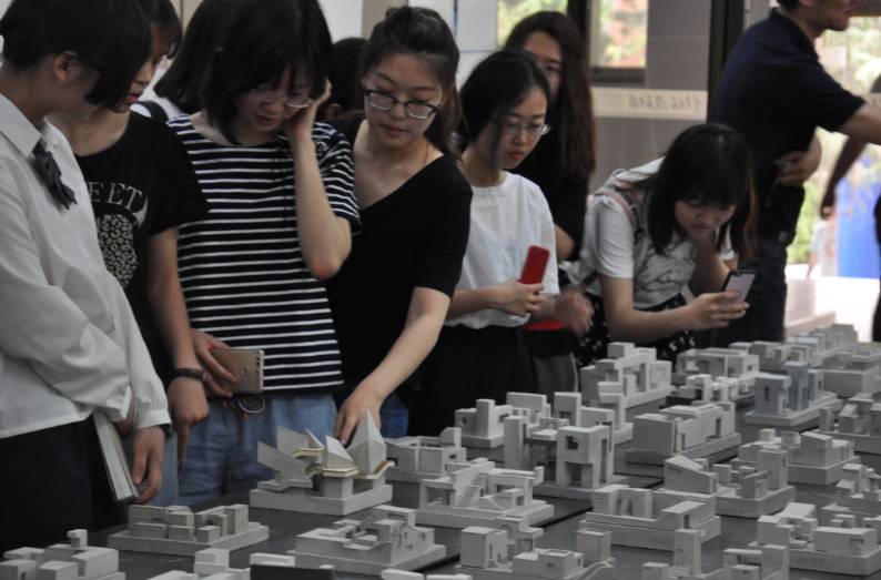 5月8日下午15时,在西城校区图书馆一层大厅的桌面上摆满了学生制作的混凝土模型,周围展板上的水墨渲染图纸看上去充满着意境。