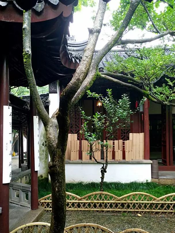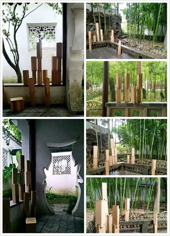 我校另一组作品名为《竹韵》,位于翠玲珑长廊转角处,取竹节的意象,设计构思是想通过高低错落的序列感觉与不同排列组合,表达园林生动丰富的韵味。在最佳观赏区另设观赏座,望人与自然相互融合,同成风景,达到填补白墙和园内景色元素的效果,与旁边的松树形成呼应关系。