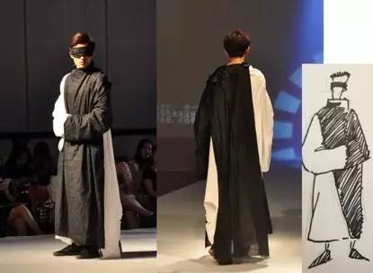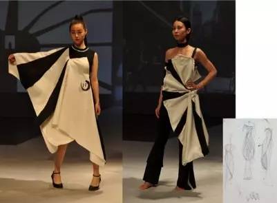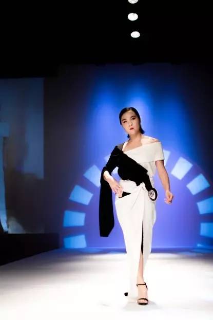 服装以不对称设计为特点,以白色来营造简约宁静的氛围,黑色加以点缀,给人视觉上带来冲击,在冲突中探寻和谐。多元化的设计组合,犹如发生化学反应的奇特再造,强调不同颜色碰撞后呈现出的惊人效果。