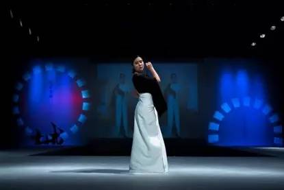 内身采用修身款式,勾勒出优美的身体曲线;阔腿裤的垂坠感反映巴黎的休闲惬意。外层侧身裙样式灵感来自巴黎老城区代表性的城市肌理——以凯旋门为中心,呈放射状向外蔓延。