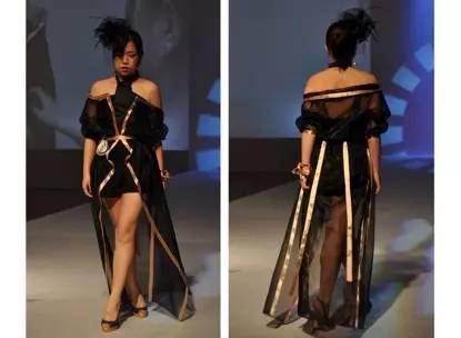 服装运用了黑色欧根纱与金色丝带的结合来打造一系列代表现代城市路网的服装。有城便有路,有黑暗就会有光。当高速路穿楼而过,地铁线路挂在天上,这一套关于夜晚的3D之城便应运而生。