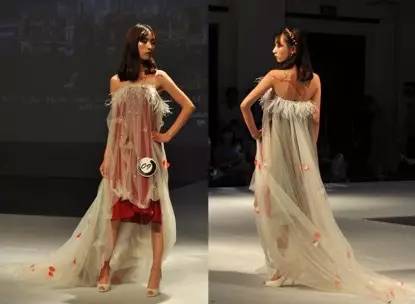 玫瑰灰,是玫瑰化作灰烬后的颜色,是一种凄凉而又高贵的美。服装的灰色中是高贵的红。重庆巴渝文化的热情与火辣被红色彰显的淋漓尽致。服装用料以纱为主,层层叠叠的纱料,由深灰到柔白的过度都体现重庆需要拨开层层迷雾才能见到的真身。身后的裙摆正如重庆的陡峭的山路,让我们一起从重庆路过。感受他的悲欢离合,抚摸他的圈圈年轮。