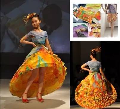 选择四川独特而色彩斑斓的丹霞地貌为主要表现对象,服装主要以不规则三角形折纸及水粉绘画等节能环保的设计手法来表现丹霞地貌的崎岖与延绵不?断的空间感。颜色以红,橙,黄色为主色调,旨在凸显丹?霞地貌的无尽的赤红峰丘,雄奇不?失雅静,刚烈?蕴含柔情。款式上,收腰的设计凸显出女性曼妙的曲线。下装裙摆前短后长, 既能衬托出红色碎岩在黄土中的夺目光彩,又能恰到好处地?出女性双腿优美的线条。