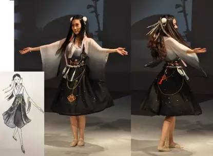 上衣的灵感源自明代襦裙,体现着北京丰富的文化底蕴。下身的裙子,从腰间到裙摆,图案从传统到现代,从传统的花鸟图案到当今的北京城市剪影,体现着时代的变迁。发饰的灵感源自明代凤冠。腰间与挂饰中制作了天坛祈年殿和故宫角楼形象的木构件,代表了以传统为骨的理念,暗示我们不忘初心。我们将古今的元素融合,力求将古典与现代交汇。