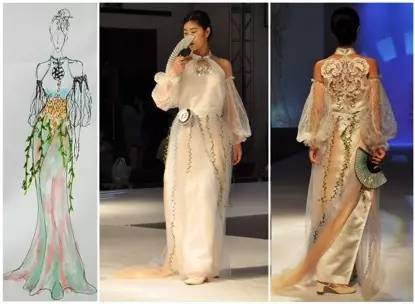 说起苏州,多半想到的是撑着油纸伞,徘徊在雨巷中,丁香一样的女子。服装以旗袍为基础,体现苏州女子的温润。采用雅粉色纱外罩淡蓝色,内敛而清冷,光影下透漏着微妙的变化,如粼粼波光中荷花闪现。在水滴领处添加了苏州园林艺术中的漏窗元素,在腰间点缀杨柳枝条,增添女子的柔情。