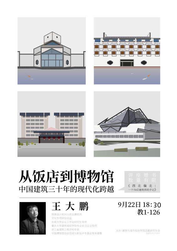 本次讲座邀请到的嘉宾王大鹏老师是筑境建筑杭州公司总建筑师、文化专项研创总监、东南大学企业工作站研究生导师、重庆大学建筑城规学院专业实习企业导师、浙江省建筑工程评标专家、中国博物馆协会空间与新技术专委会常务理事,也曾参与程泰宁先生设计的浙江美术馆项目。对于中国建筑三十年发展的历程,王大鹏老师选取了饭店类和博物馆类建筑分析作为切入点。
