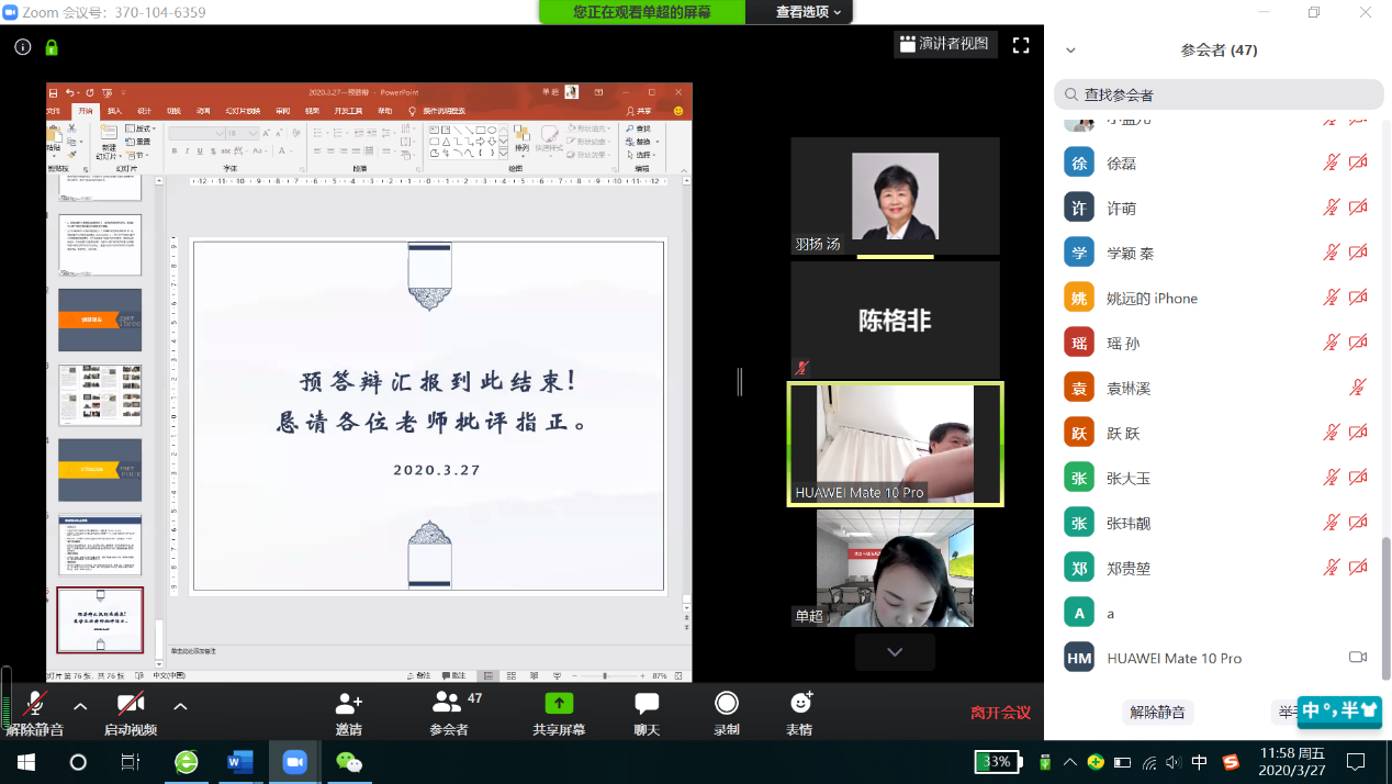 甘振坤、单超等4名博士研究生分别在家中以在线视频方式汇报了学位论文进展情况,7位专家逐一进行进行点评并提出问题。经专家组认真讨论后,对研究生学位论文下一步的改进工作提出了建议和意见。答辩专家组还表示,虽然在特殊时期,博士预答辩方式进行了创新式调整,由于准备充分、流程严格,能达到与现场答辩同样的效果。