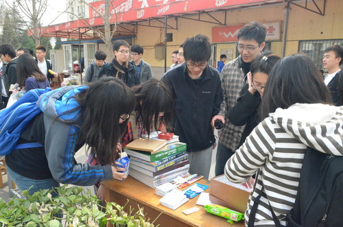 2014年3月18日中午12时,努努影视 在西城校区食堂南门门前组织了一场别开生面的活动——“跳蚤市场”。此次活动以班为单位,在学生会的精心安排下,各班纷纷找到了自己的摊位。不少同学将自己携带的物品精心布置,使尽浑身解数来推销自己的产品,吸引了很多同学的关注。物品琳琅满目,大部分与同学们的学习生活有关,如书籍、颜料、画纸等。