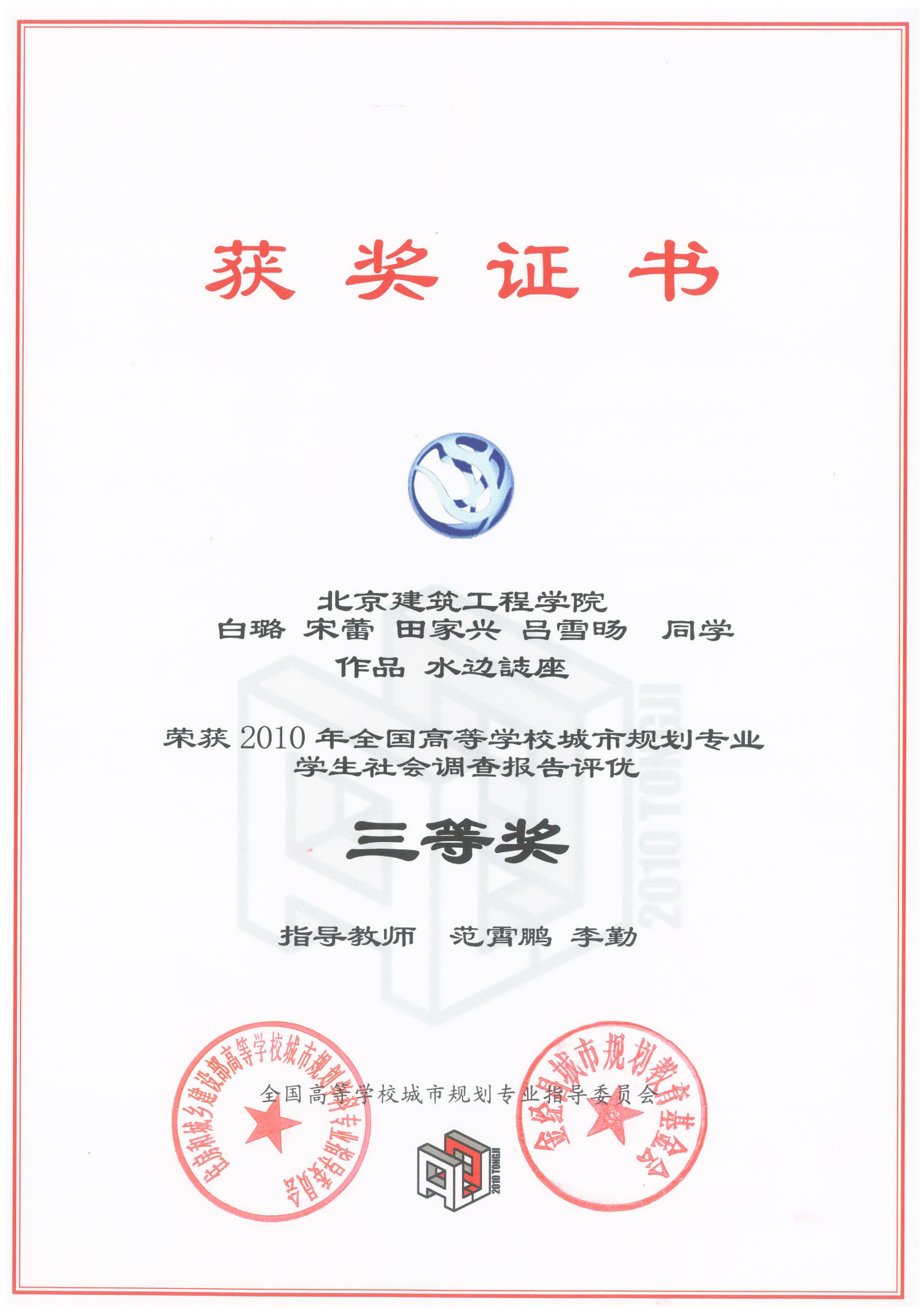 学生喜获2010年全国高等学校城市规划专业学生社会调查报告评优三等奖