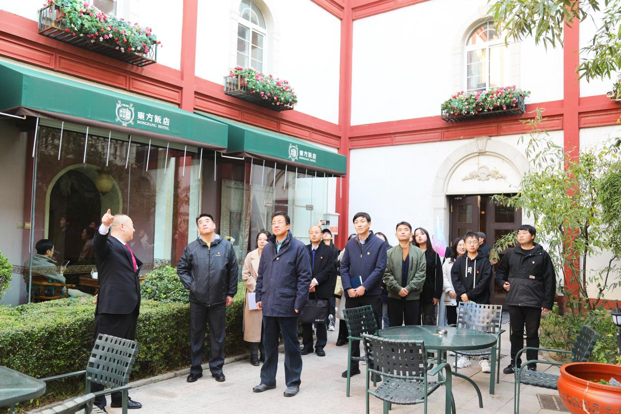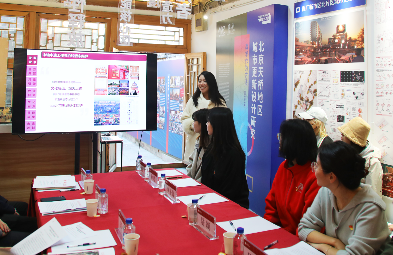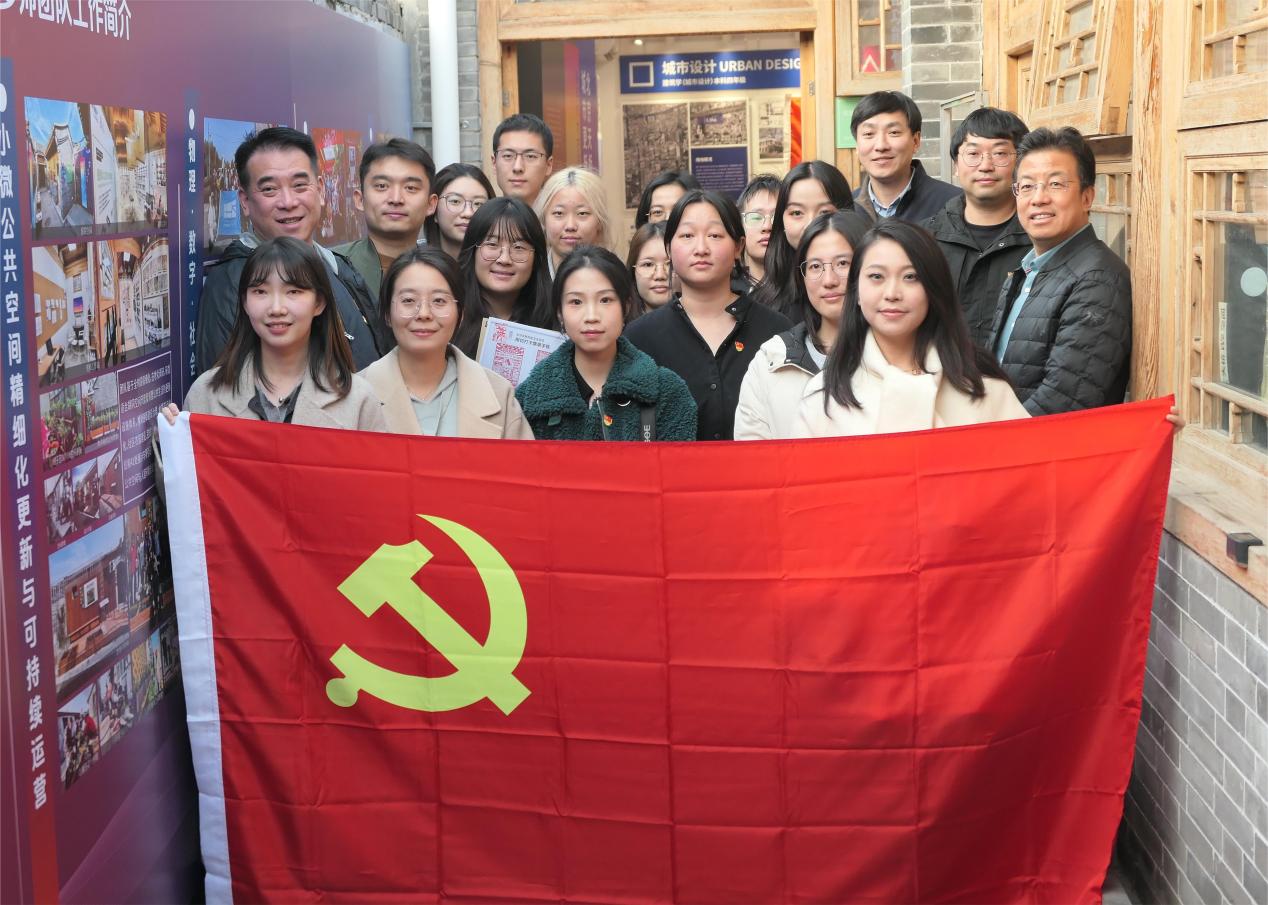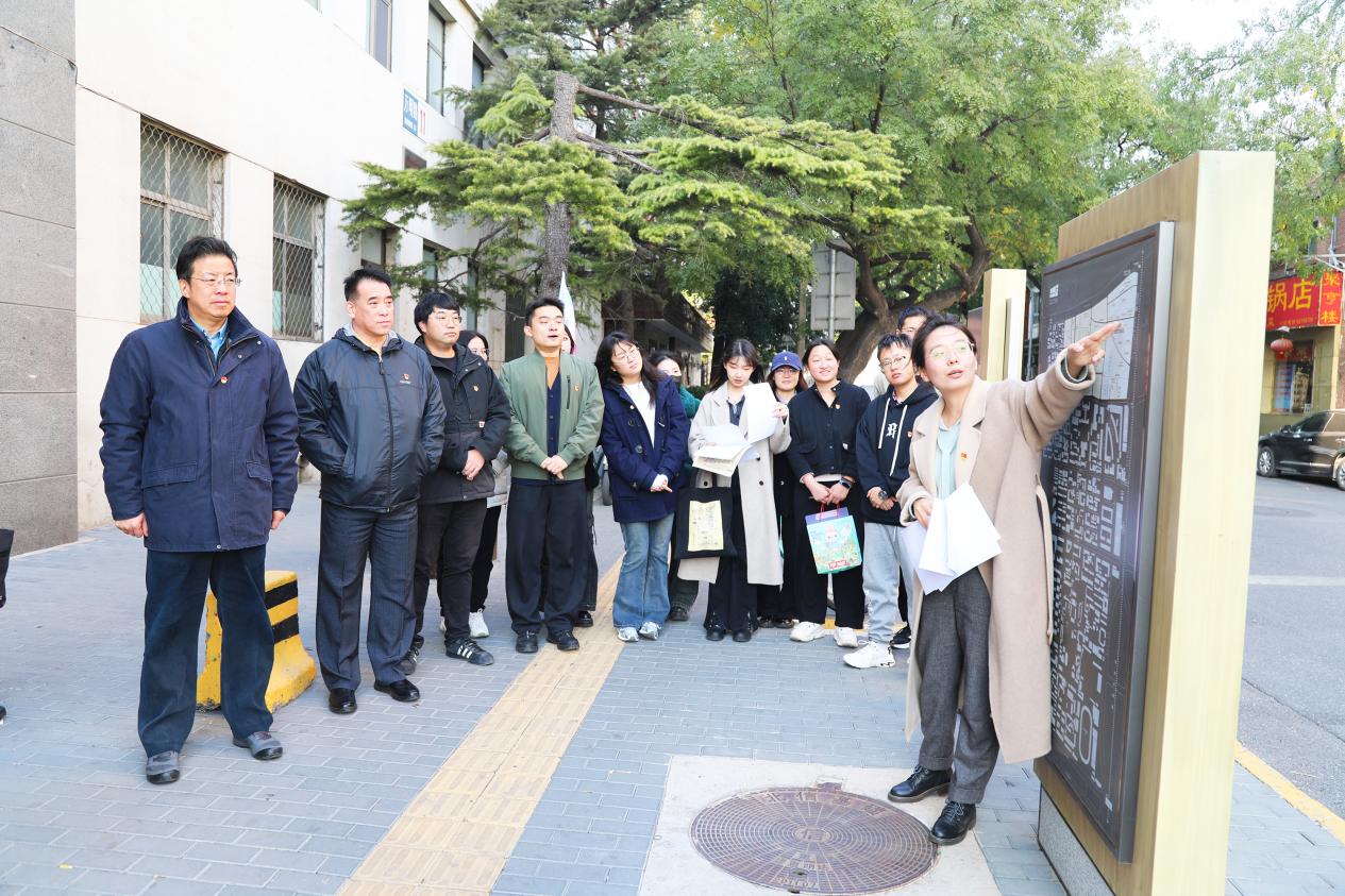 天桥文化探访环节,师生共同参观了五四新文化运动的名人常驻的北京东方饭店、新世纪游艺园旧址等红色点位,了解天桥地区红色革命历史。随后,游览了泰安里文化艺术中心,这里是西城区首批文物建筑活化利用计划项目之一,也是学校泰安里建筑文化艺术中心·建筑遗产活化利用驻地实验室等平台驻地。沿着探访路线,师生党员继续深入了解了北京南中轴天桥留学路地区的历史文化,参观了胡同焕新立面改造施工现场,感受了老北京充满烟火气息的热闹场景。