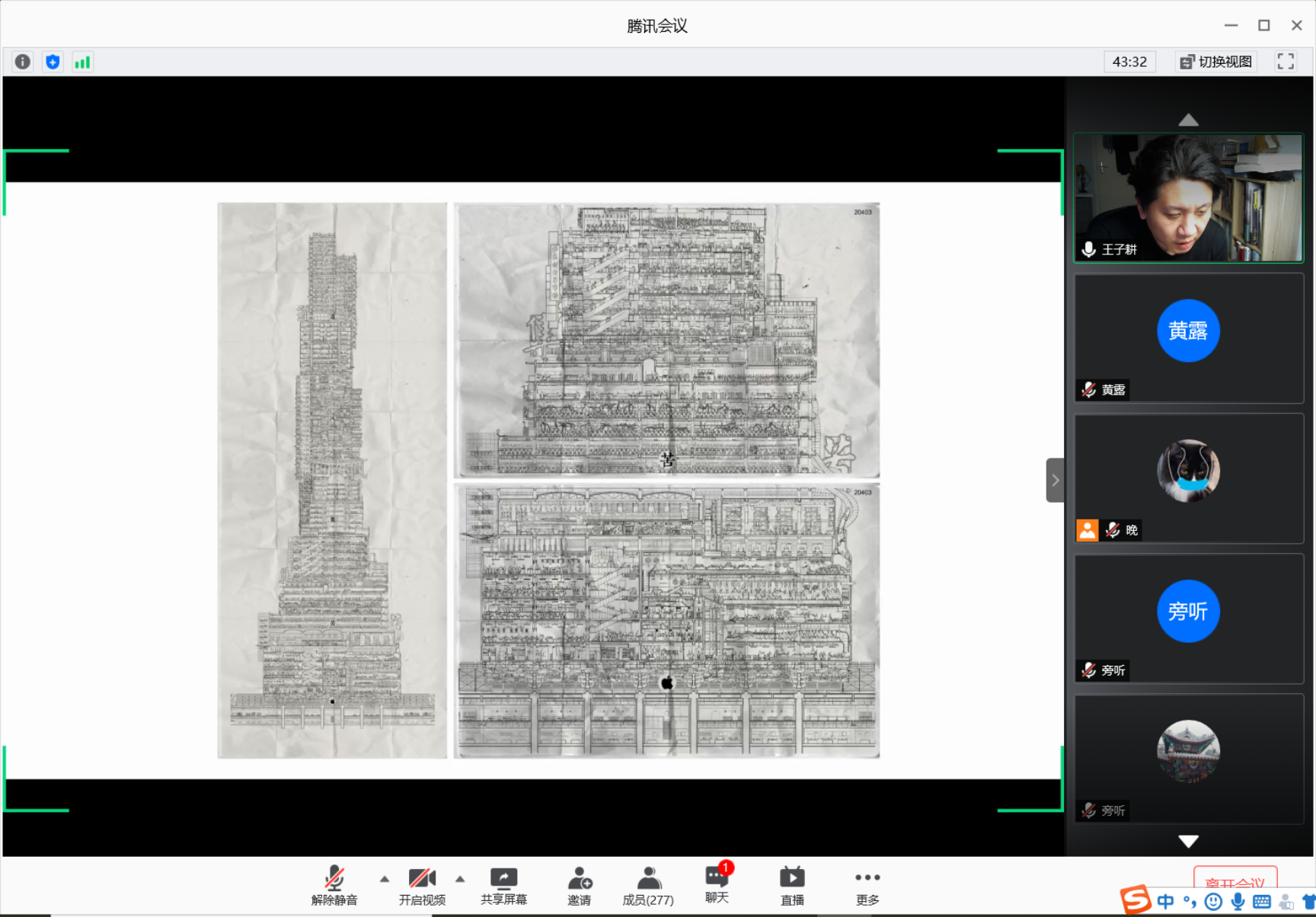 王子耕首先在“思辨”部分向线上听众分享其学习期间的若干设计作品,随后在“叙事”部分详细讲解在工作与教学期间的若干跨界实践作品,讲述对电影、环境、人文、哲学、社会和建筑等多层面的思考与探索。嘉宾讨论环节,鲁安东教授提出,讲座中所讨论的思辨是一种更高级的智力活动,而叙事在本质上是该活动行动力的构成部分,进而对年轻建筑师提出“回到对现实理解的行动”的建议。金秋野教授谈到,主讲人把一种带有批评性的意见演变成空间实践,以建筑师的身份用空间进行文化叙事,可以比拟为“厨师出身的美食家”。自由提问阶段,同学们踊跃发言,提出关于中国建筑叙事特点、设计跨界、建筑话语权等问题,王老师及参会嘉宾共同探讨解答。
