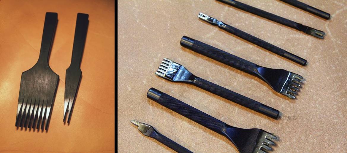 手工缝制皮革和手工缝制布料最大的区别就是缝制皮革要首先按照设计的线迹在皮革上打孔,然后再用针线沿着这些打好的孔缝制。打孔经常用到的工具叫做斩。