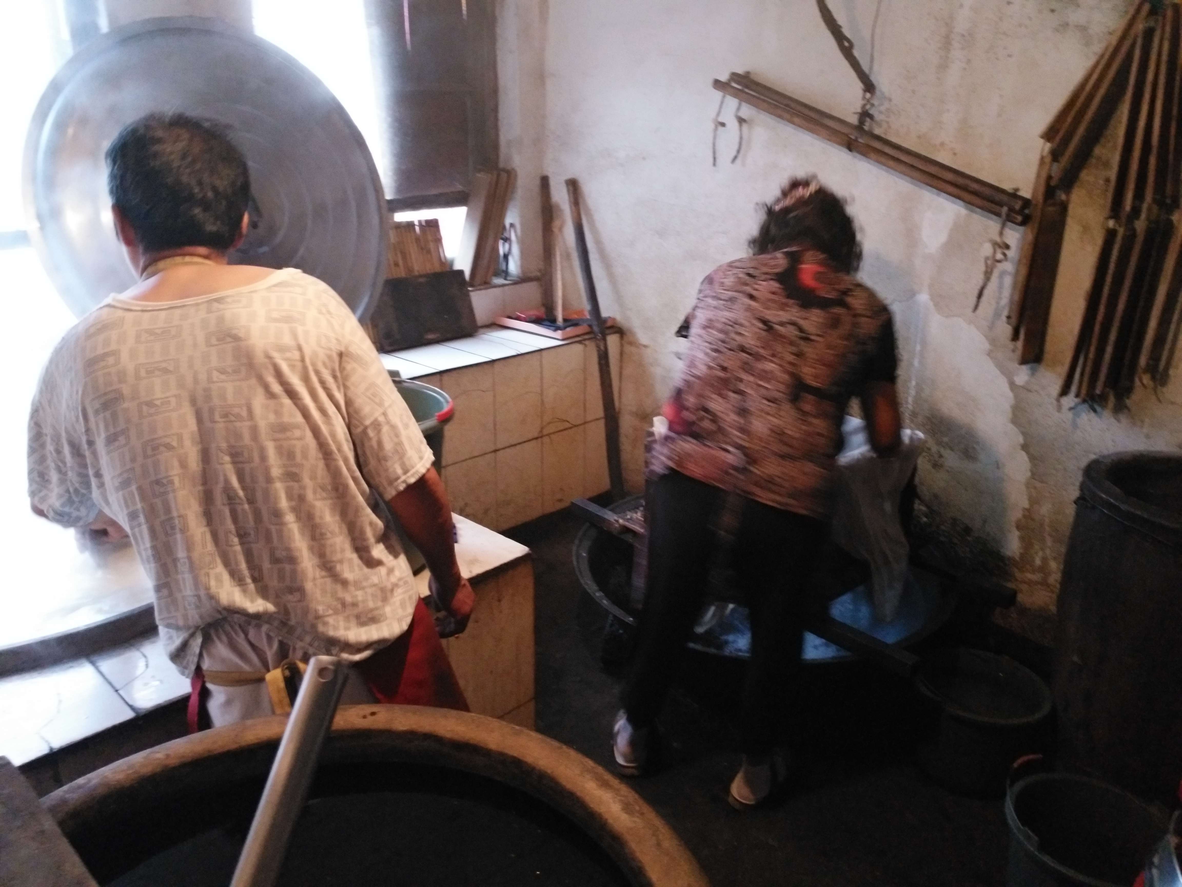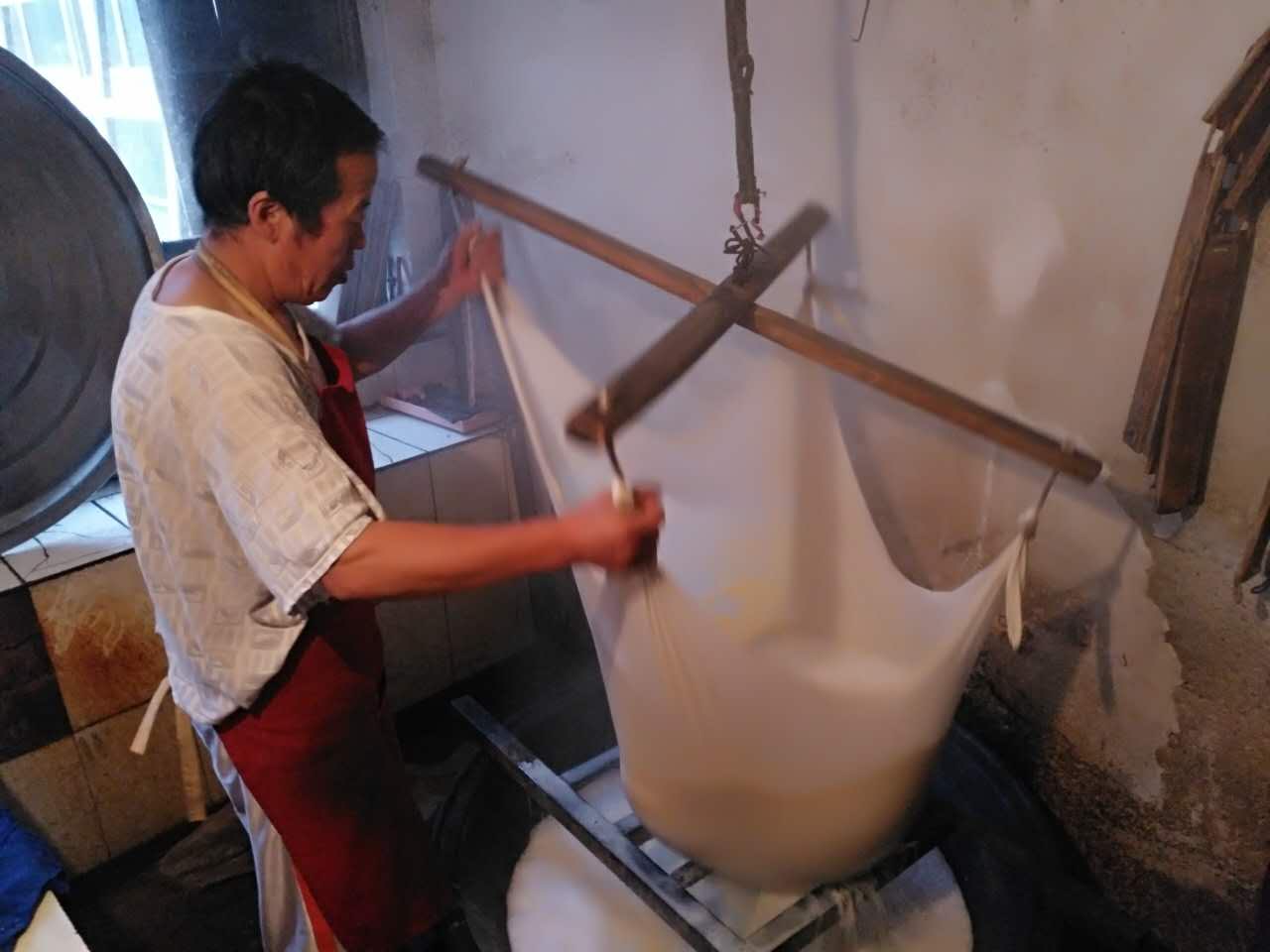 第二天清晨五点,实践团成员来到当地一家做豆腐的老作坊。走进作坊,浓浓的豆香扑面而来,一个老师傅拿着瓢舀着锅里即将沸腾的豆浆。在我们来之前,老师傅已经磨好了豆子,榨成了豆浆,大锅熬制。经过了二十多分钟的高温,下一步就是筛豆渣,经过白色纱布的过滤,醇香的豆浆就可以喝了。接下来便是酸水点豆腐的关键步骤了。柳沟的豆腐之所以驰名中外,秘密就在这酸水上,不同于含有添加剂的卤水,这里所用的酸水完完全全由之前的豆汁发酵而成,无添加,纯天然。一勺酸水混着豆浆慢慢混合,重复添加两桶酸水,直到锅中的豆浆渐渐抱团凝固。不一会儿,豆浆和豆腐之间的半成品就是豆花了,老师傅热情地请我们尝了尝,鲜嫩无比,入口即化。最后,便是要把豆汁抽出留作酸水发酵备用,将半凝固状态的豆腐舀出放入容器定型。