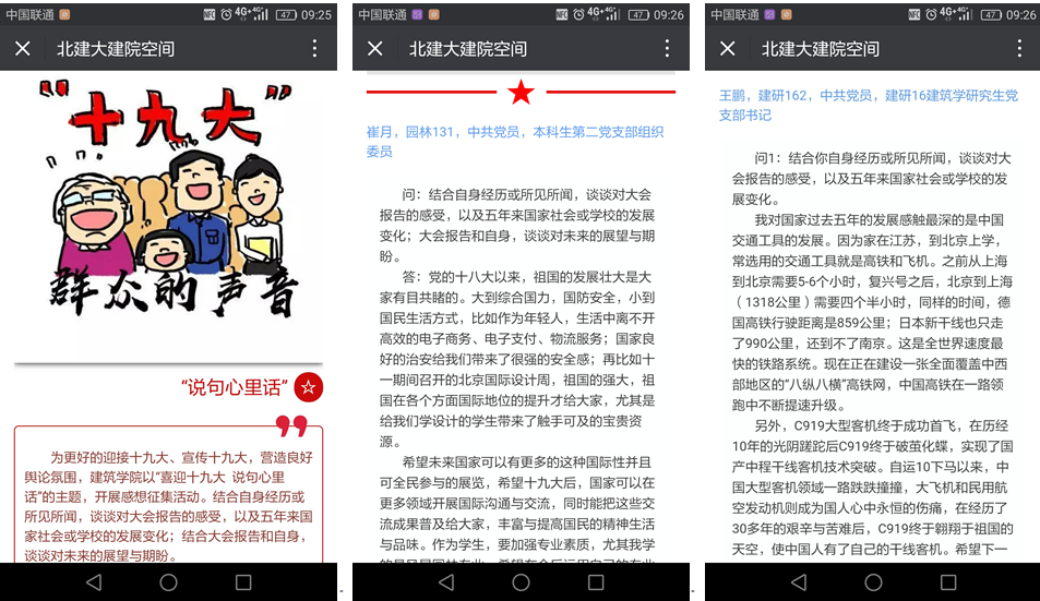 为更好的迎接十九大、宣传十九大,营造良好舆论氛围,学院以“喜迎十九大,说句心里话”的主题,开展感想征集活动,号召学生结合自身经历或所见所闻,谈谈对大会报告的感受,以及五年来国家社会或学校的发展变化,或谈谈对未来的展望与期盼。此次活动收到了学生的积极投稿,他们在感想中积极表达和深切领会习近平总书记工作报告与重要讲话精神。对党和人民确立的理想信念倍加坚定,对党肩负的历史责任倍加清醒。祖国蒸蒸日上,我们身为青年人应该有一种急迫感,在不断充实理论知识的基础上,要脚踏实地,深入社会,丰富自己的实践经验。在未来的日子里,要不忘初心跟党走,用自己的努力为国家献力,牢记作为青年一代的使命,肩负青年的责任,努力学习充实自我,为中国梦助力