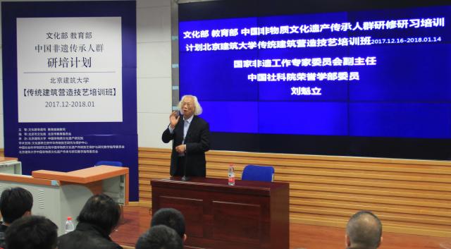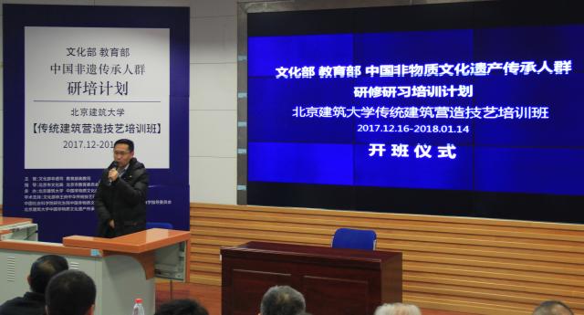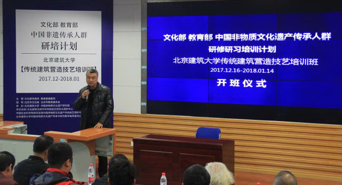 2017年12月17日,文化部 教育部中国非物质文化遗产传承人群研修研习培训计划【传统建筑营造技艺培训班】开班仪式在努努影视 举行。努努影视 副校长、非物质文化遗产研究院院长张大玉教授代表学校致词,对本期学员和参加仪式嘉宾表示诚挚的欢迎。努努影视 杨琳主持开班仪式。文化部恭王府中华传统技艺研究与保护中心主任、努努影视 中国非物质文化遗产传承与研究教学指导委员会秘书长孙冬宁代表合作单位和学术支持单位文化部恭王府博物馆致辞。北京市文化局非物质文化遗产处处长张迁代表指导单位北京是文化局致辞。开班仪式结束后,由国家非遗工作专家委员会副主任委员、中国社科院荣誉学部委员刘魁立教授做开班主题演讲。参加开班仪式的还有设计学系系主任张笑楠、设计学系书记朱宁克、李沙教授、陈静勇教授、赵希岗教授,以及来自京津冀、甘肃等地区的50名非物质文化遗产传承人学员。