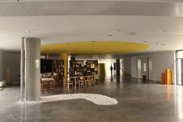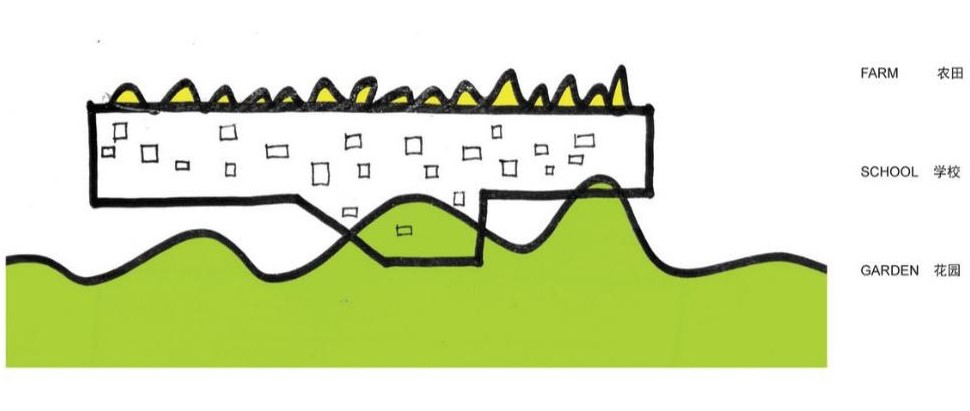 可以说我的母校是中国各个学校中的一个“异端”。它的造型不再是整齐的死板的楼房,而是一体的流动的鱼骨结构,细心的人会发现俯视看学校的建筑整体很像汉字“美”,也许这只是一个美妙的巧合,可我仍记得那年第一次进入那个校门时感受到的新奇与震撼。鱼骨型的建筑整体将教学、娱乐、饮食、自习、阅读各个功能串联覆盖在一个整体里。学校的整体基调是灰色,并且让墙体的原始建筑材料清水混凝土暴露,地面也保留了混凝土的本质,再加上学校整体的“教学+田园”的设计思路——用绿地覆盖隐藏的体育馆、大礼堂、停车场等功能区,并且楼顶全面绿化,让整个校园更自然本真。校长告诉我们学校不会在墙体上挂字或做一些多余的装饰,因为灰色是贵族的颜色,无需装饰。简约自然,展示本我,坦然而大气。