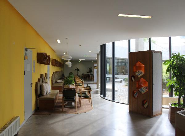 四排建筑由一个奔跑长廊串联在一起,学生的活动区、学生的阅读自习区、多媒体组的活动区、生物博士站等都利用了串通整栋建筑的走廊空间。可能有人不理解也难以想象我们如何占用走廊,但这个走廊本身就是有交流、思考、阅读等功能在其中,走廊里有许多有机形状的半封闭空间,是交通“大河”中一些交流的“岛屿”就是设计师专门为学生们提供的休息、思考、探讨的空间。走廊不再是简单的交通空间,而是南北贯通的连廊,以及时而冒出的“发芽”空间,是学生们全天候的室内活动场所和与教师交流答疑的空间。教室外的走廊里,学生们的储物柜和高低起伏的外窗共同构成有节奏的韵律。教室中南向出挑的铝窗套有效的解决夏季遮阳问题,在传统的四边形上将靠走廊一边多做了一个梯形空间为展示交流的空间。而墙体虚实相间的构成,引入北向天光,可开启的高窗形成空气对流改善通风。天花的穿孔吸音石膏板有效地控制教室的声环境。