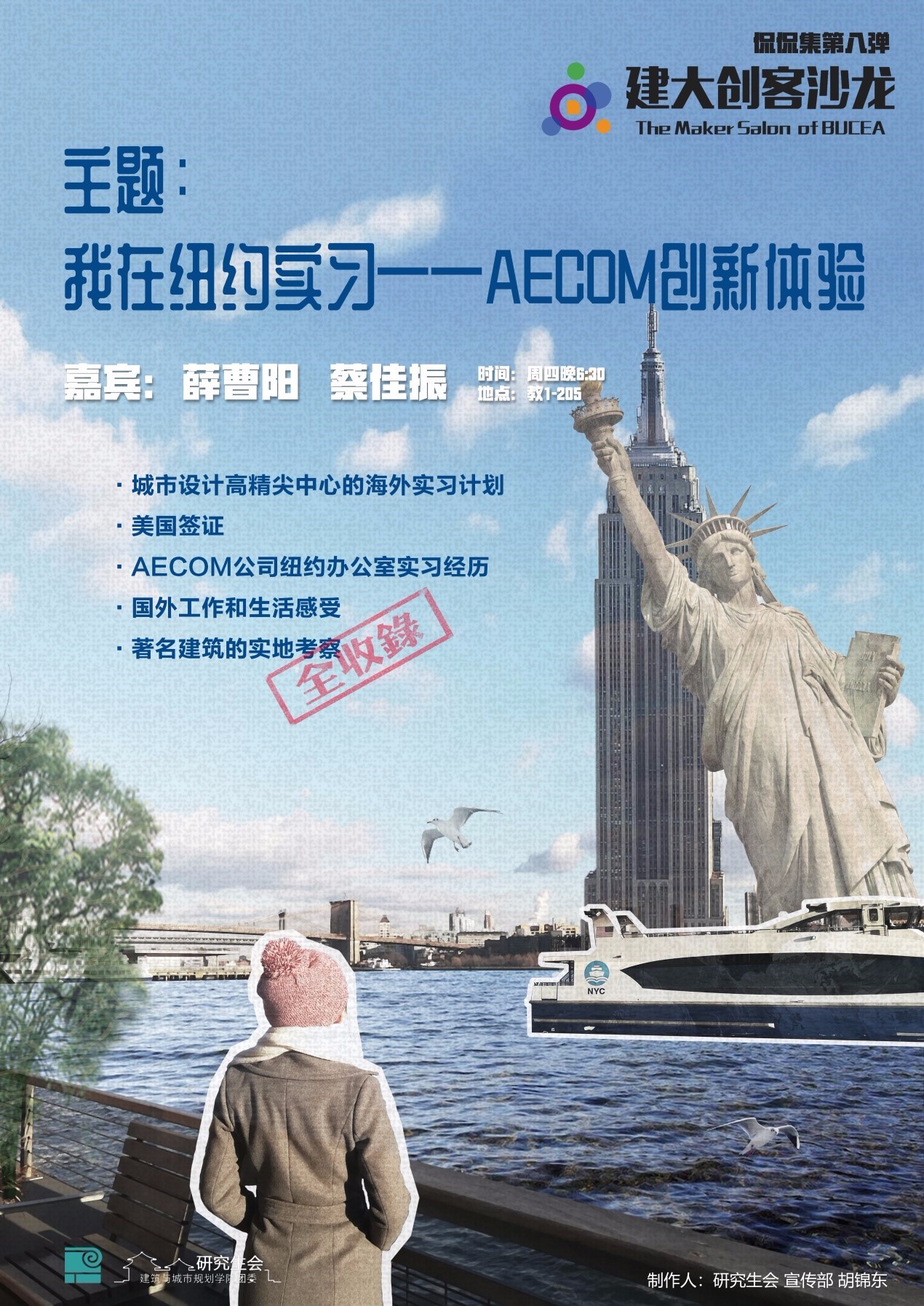 2018年3月,建大创客沙龙正式开讲,努努影视 侃侃集系列学生沙龙,作为创客沙龙活动的一部分,于3月15日晚6点30分,在我校西城校区教一205教室开展新学期的分享。侃侃集学生沙龙,是努努影视 研究生会主办,由学生作为主讲人的特色创新沙龙,本次沙龙是侃侃集系列活动的第八弹。寒假期间,北京未来城市设计高精尖创新中心选派努努影视 2016级硕士研究生参与海外实习计划,前往美国纽约AECOM公司开展实习实践。本场沙龙邀请到参与该实习计划的薛曹阳、蔡佳振两位同学与大家分享他们的实习及创新体验。