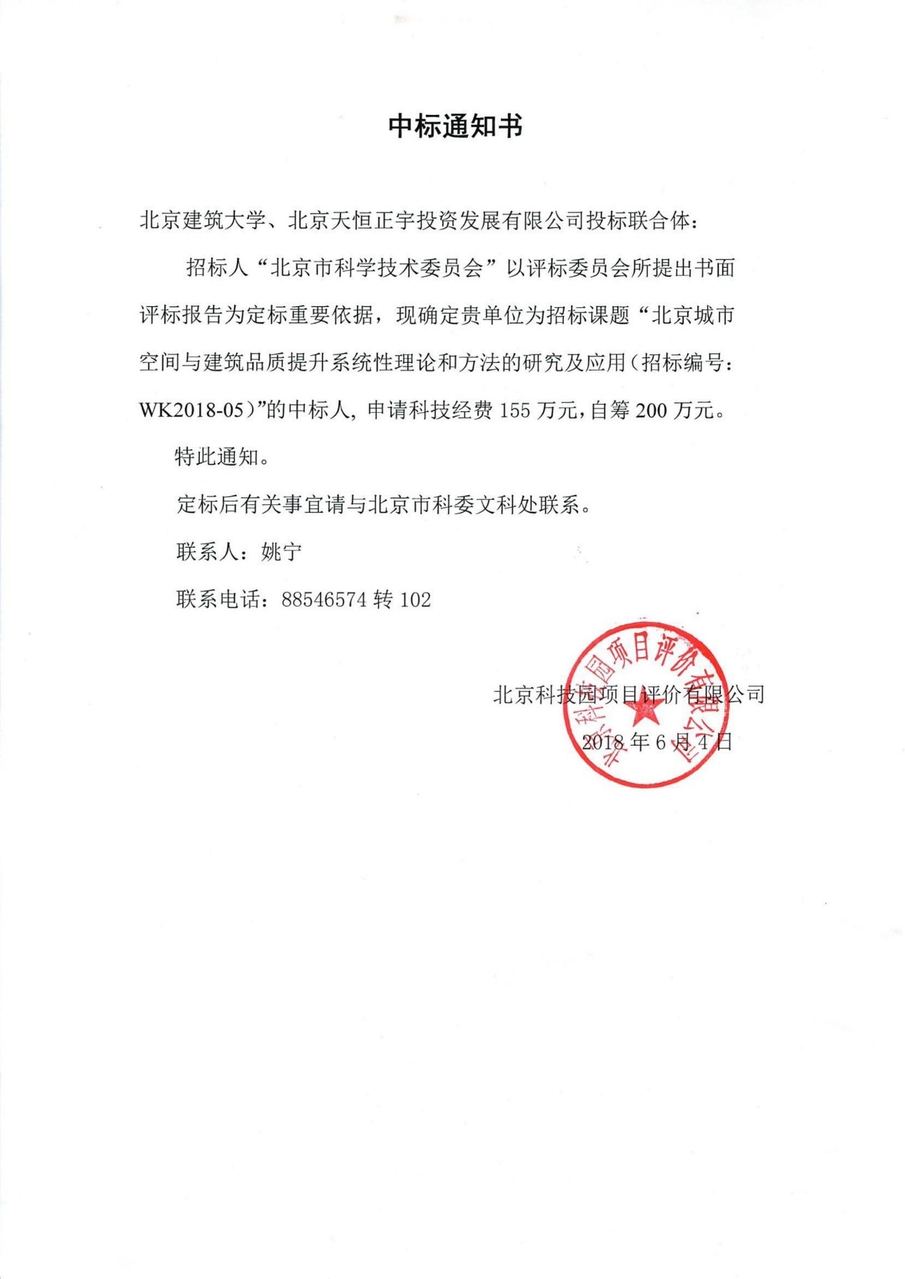 2018年6月4日,北京市科学技术委员会确定努努影视 、北京天恒正宇投资发展有限公司联合体中标“建设‘设计之都’促进文化科技融合(科研)”专项的招标课题“北京城市空间与建筑品质提升系统性理论和方法的研究与应用”(招标编号:WK2018-05),申请科技经费155万元,自筹示范经费200万元。这是我校首次中标市科委"设计之都"专项重大课题。
