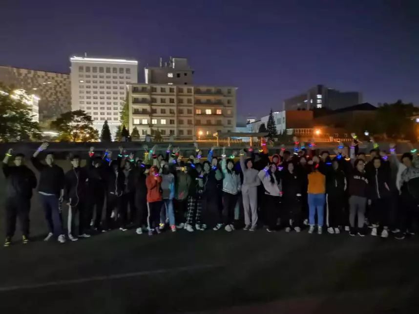 晚上8点,夜幕降临,同学们在操场集合,佩戴好荧光手环,给黑暗里增添了几抹亮色,亮丽的荧光下,笑声充斥着操场,活动气氛渐浓。