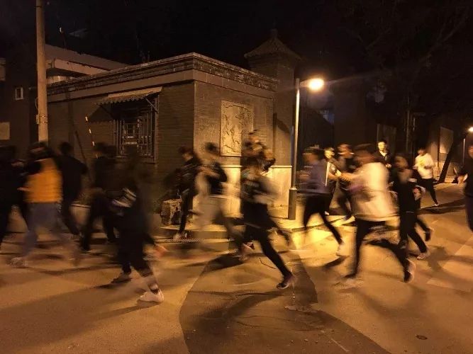 之后,队伍从大马路转移到小巷子,安静小巷中昏暗的路灯下,一束束荧光晃动着。同学们抛弃了课业后的疲倦,迈开步伐,享受着运动中的激情,体味着北京街巷夜色中的静谧。