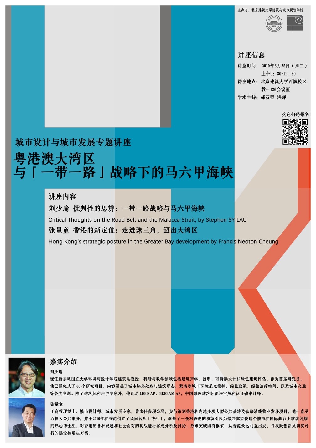 建设粤港澳大湾区、开展“一带一路”经济合作是新时代下推动形成全面开放格局的新发展战略,也是推动“一国两制”事业发展的新实践。为了让同学们增进对这两项国家发展战略的了解,6月25上午郝石盟老师特别邀请到新加坡国立大学设计与环境学院的刘少瑜教授和香港著名城市设计师、城市发展专家张量童先生从“大湾区”与“一带一路”建设角度,围绕马六甲海峡与香港等关键性发展因素做了精彩的讲座。