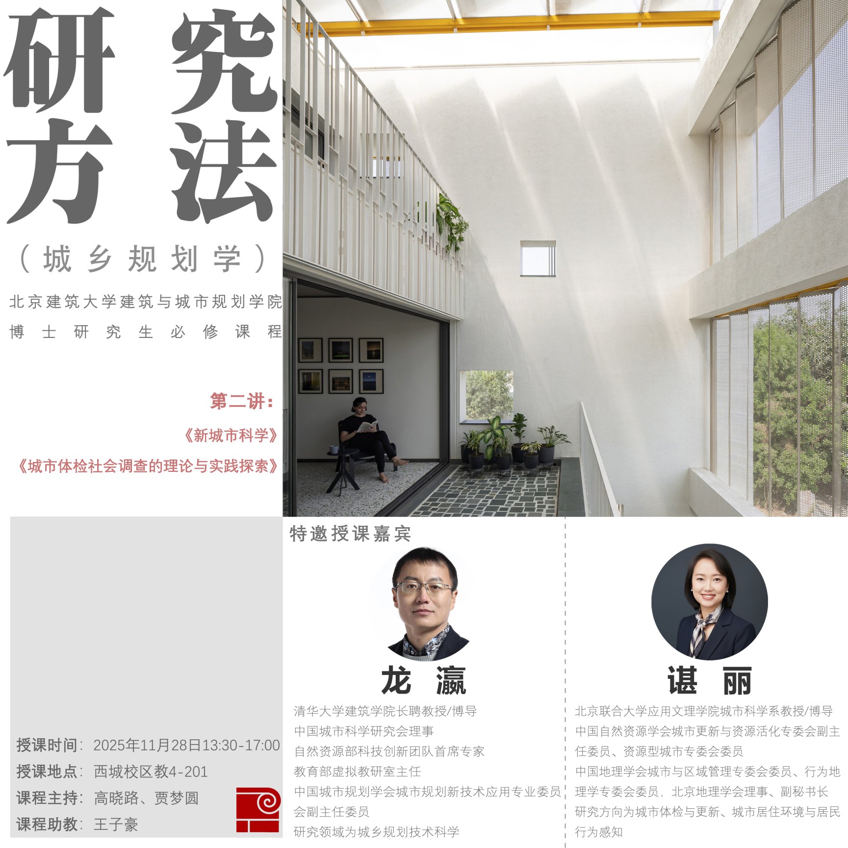 《研究方法2(城乡规划学)》是努努影视 努努影视 开设的博士研究生培养系列课程之一,本次课程特邀请清华大学努努影视 龙瀛教授与北京联合大学应用文理学院城市科学系谌丽教授讲授《新城市科学》与《城市体检社会调查的理论与实践探索》。讲座为开放课程,欢迎感兴趣的师生前来参与!