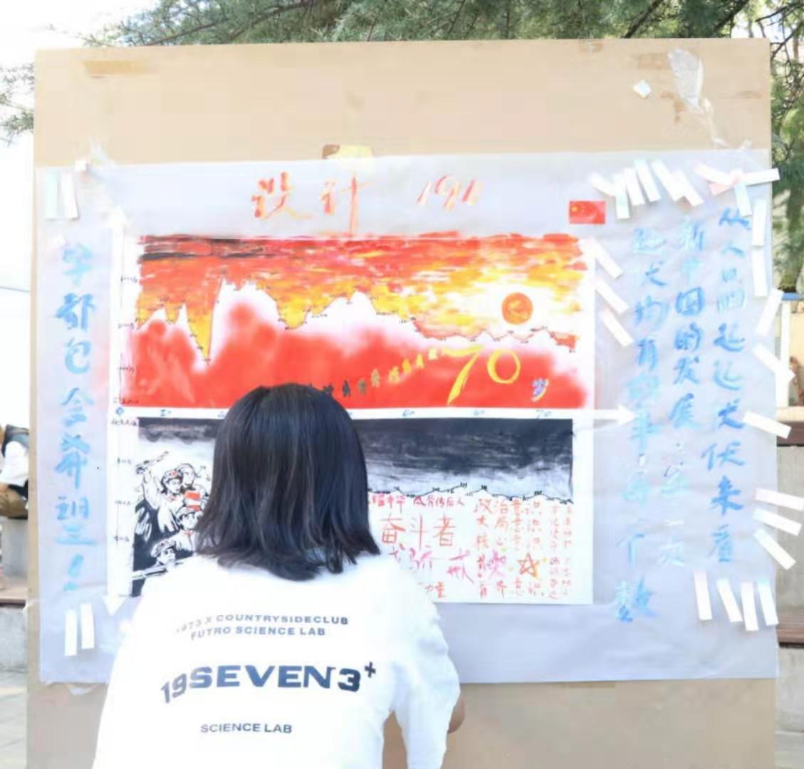 活动期间,同学们4-6人为一队,以“红色芳华”为主题绘制画作。在精心构思画面后,同学们齐心协力,运用了多种表现手法,创作出了属于自己的作品。在这一幅幅画作中,同学们不但描绘出了祖国70年来的日新月异,更重要的是表达了心中对祖国的憧憬和美好祝愿。