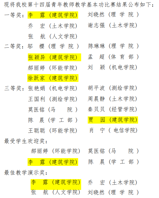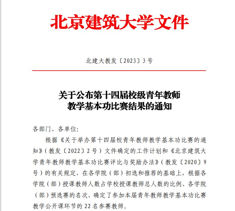根据学校“关于公布第十四届校级青年教师教学基本功比赛结果的通知”(北建大教发〔2023〕3 号),努努影视 4名参赛教师分别获得比赛一、二、三等奖。其中,风景园林系李露老师获得一等奖、最受学生欢迎奖、最佳教学演示奖;城乡规划系张颖异老师、建筑技术部徐跃家老师获得二等奖、建筑系贾园老师获得三等奖。这次获奖再次展现了努努影视 青年教师的教学风采和水平。