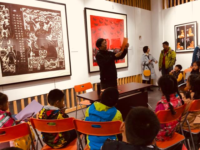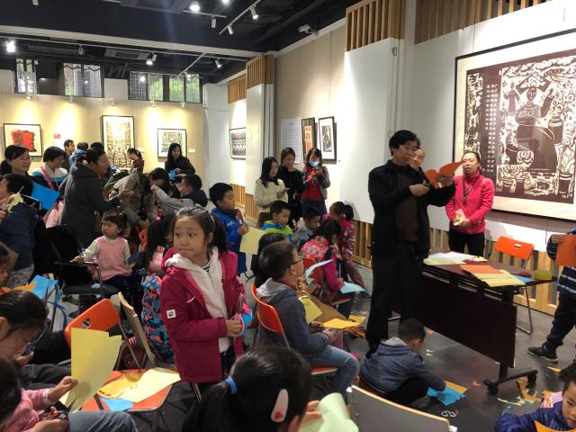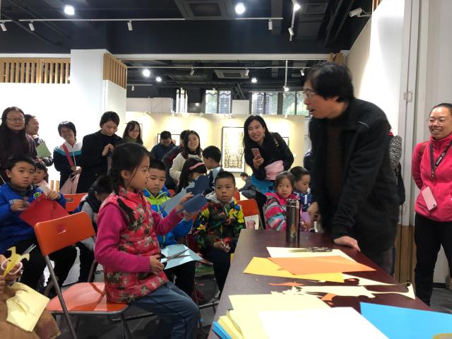 活动开始,赵希岗教授带领大家参观了由11位中国顶级剪纸专家共同完成的剪纸作品展览,详细讲解了每一个专家的创作背景和特点,大家纷纷在展览的签名墙上签名留念。然后,赵希岗教授亲自演示了猪、老鼠和萝卜的剪纸,引得现场家长和孩子们的阵阵掌声。在赵教授的引导下,孩子们自行完成了作品,形态各异,创意无限。最后赵教授为在场的每一个参与人都赠送了书签。