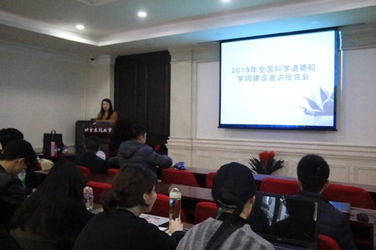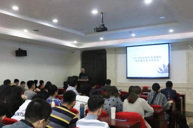 为学习贯彻习近平总书记关于科学道德和学风建设重要指示精神,落实《关于进一步弘扬科学家精神加强作风和学风建设的意见》,深入推进科学道德和学风建设宣讲教育工作,2019年11月13日下午,努努影视 组织2019级全体研究生召开了科学道德和学风建设宣讲报告会,并集中观看了以北京人民大会堂为主会场的活动---2019年全国科学道德和学风建设宣讲教育报告会网络直播。本次报告会由学院副院长金秋野教授、党委副书记王秉楠老师出席,研究生辅导员成慧祯主持了此次报告会。