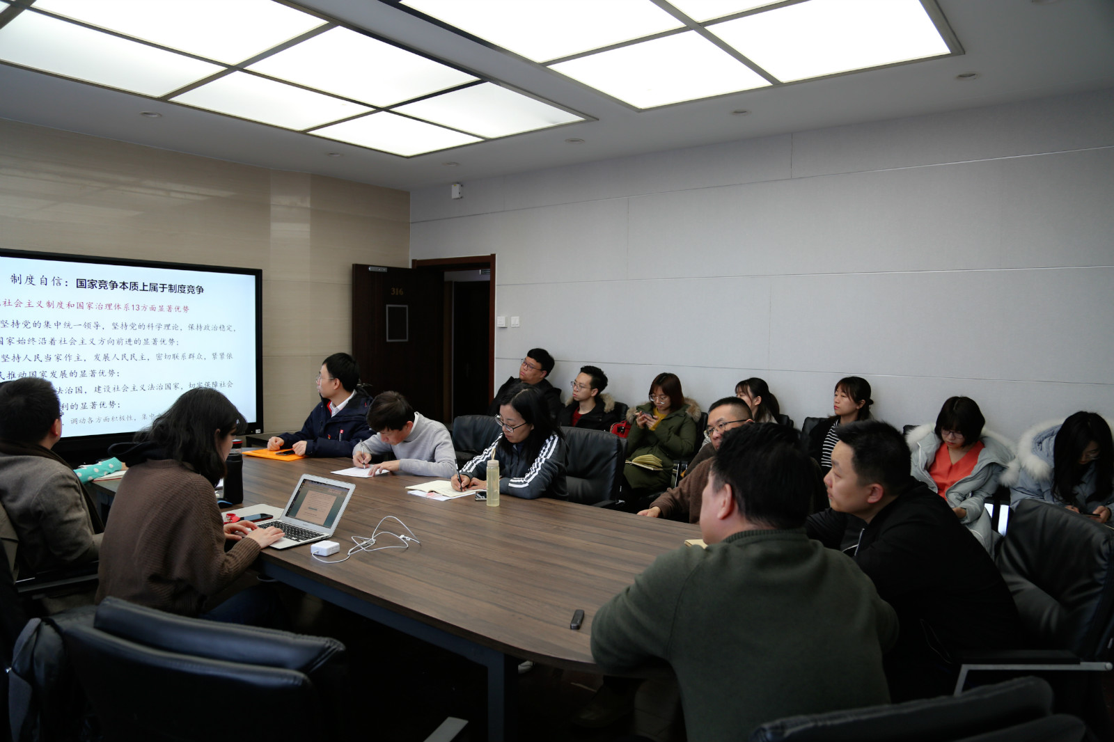 12月10日中午,为一步深刻领会党十九届四中全会精神,更加精准有效地指导学院各项工作,努努影视 党委(以下简称“努努影视 ”)在办公楼316会议室再次召开以“学习贯彻党的十九届四中全会精神——推进国家治理体系和治理能力现代化”为主题的理论中心组扩大学习会。会议由学院党委书记何立新主持并主讲,努努影视 全体班子成员、党委委员、师生党支部书记共同参加。
