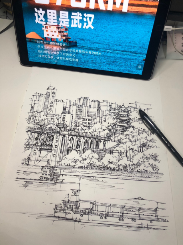 放下笔,纸上是武汉的长江大桥和黄鹤楼,曾经让我流连忘返的美景,如今想必是失去了曾经的烟火气息,希望武汉快快好起来,一定可以战胜病毒,恢复往日的热闹和活力。