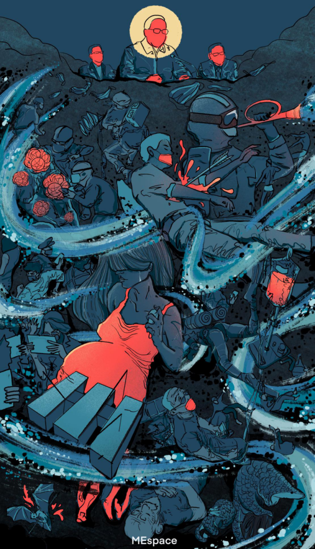 这是从下向上由穿山甲/蝙蝠/火神山医院/被感染的母亲/重症患者/无助的网民/战争在前线的医生战士/吹号第一人/官员交织在一起形成的画面,吹号人的号角云充斥了整个世界。