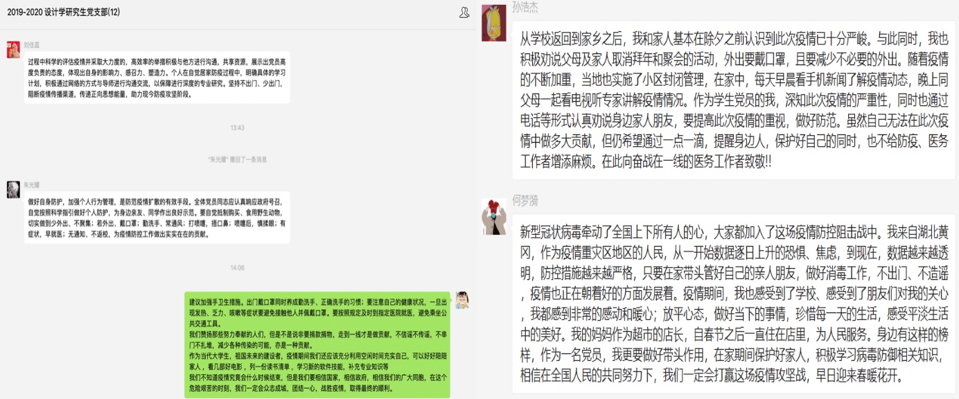 博士研究生党支部书记王阳谈到:“新冠肺炎疫情对我们来说是一场严峻的考验,对于学生党员来说,我们首先要做的就是严格遵守国家相关规定,执行上级党委的统一部署。这是考验党性是否坚定,是否能够发挥党员为人民服务精神的时刻。作为学生党员,要执行好党的任务,履行党员义务,通过宣传科学的防疫知识、努力进行科研学习等实际行动打好这场防疫攻坚战,为社会做出贡献。”