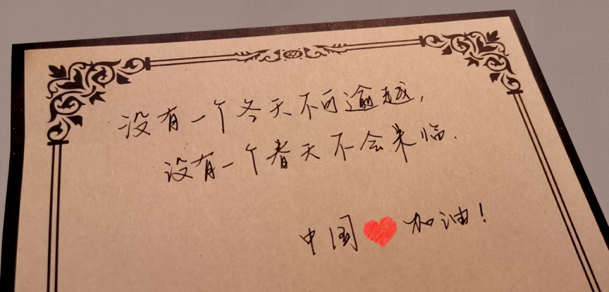 2020年中国春节到来的前夕,一场来势汹汹的新型冠状病毒疫情让这个节日变得不同以往。这场“战疫”是一场看不见硝烟的战争,没有一个人可以选择置身事外。逆行的无双国士奔赴前线让我们感受到了这个至难时刻的慰藉与希望,虽然我们无法像直奔前线的医疗队一样在危难时刻“不计报酬,无论生死”般的挺身而出,但我们可以以自己的方式选择与武汉共战,在这个特殊时刻听从学校的指示照顾好自己,照顾好身边的人。那些杀不死我们的,终将使我们更强大。没有哪个冬天不可逾越,我们相信,春暖花开的时刻终将来临。面对这场没有硝烟的战争,万众一心,众志成城,我们有信心战胜疫情迎接真正美好的春天。加油武汉,加油中国!