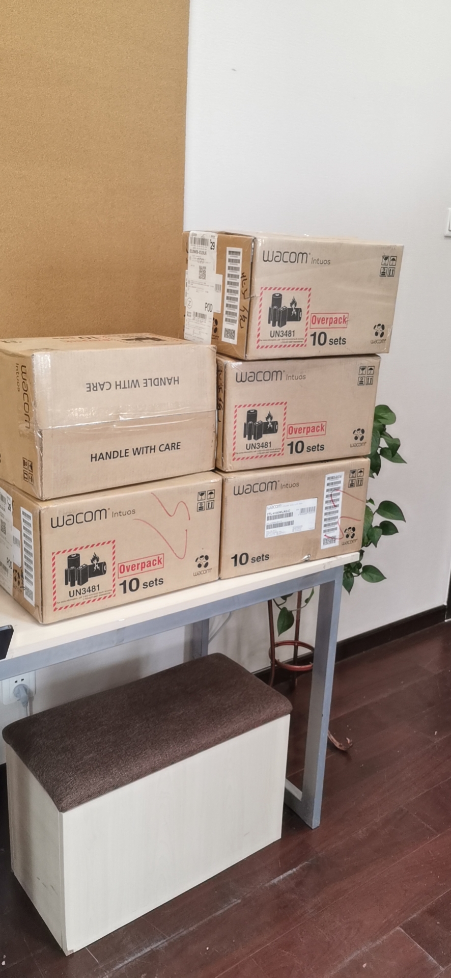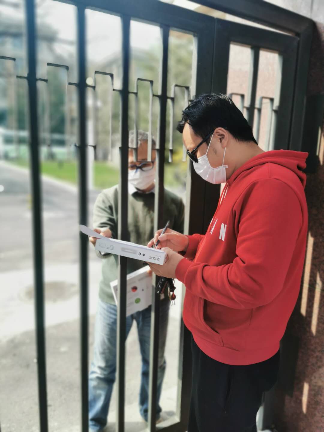 学校教务处充分考虑努努影视 核心课程——设计类课程的教学特点,即以设计原理讲授与设计讨论相结合的互动式教学为主。他们积极想办法多方联系货源,为老师们提供在线互动教学的辅助设备——Wacom数位板,它能助力老师们有效顺畅地进行线上的文字书写、图形绘制与设计交流、讨论。因疫情期间备货有限,需分批发放,在这种情况下,学校仍急人所急,在2月24日专门为努努影视 配备了50个,旨在尽早用于设计教学中。第二批50个写字板在3月24日中午,从大兴校区运抵西城校区。