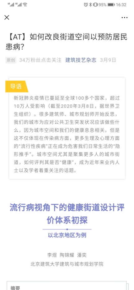 2020年伊始,新冠肺炎疫情汹汹而来,席卷全球。疫情下,健康环境设计与研究中心的老师们发挥专长、助力抗疫工作。近期,郝晓赛老师参与了由相关政府部门牵头的既有医院改造设计研究工作,并针对民众关注的医院建筑设计,做了大量科普工作:应邀去一席进行了《什么是好的医疗建筑演讲》、在抖音直播进行了《建筑师眼中的“好医院”》讲座,参加北京城市广播题为《2020北京高招直播咨询—后疫情时代的热门专业:建筑学、土木工程》的高招咨询工作,应邀发表了《疫情先行军和中国医院建筑本土发展新契机》等数篇医院建筑设计研究的公众号推文,反响热烈。李煜老师应对本次新冠肺炎疫情,应邀向北京市委办公室提交内参,介绍健康影响评估(HIA)策略与方法。新发论文《防疫社区规划——平非结合的健康社区设计初探》《流行病视角下的健康街道设计评价体系初探》等,并在杂志公众号推送,引发热烈反响。应邀在中央美院做《流行病:一部社区规划的历史》讲座。