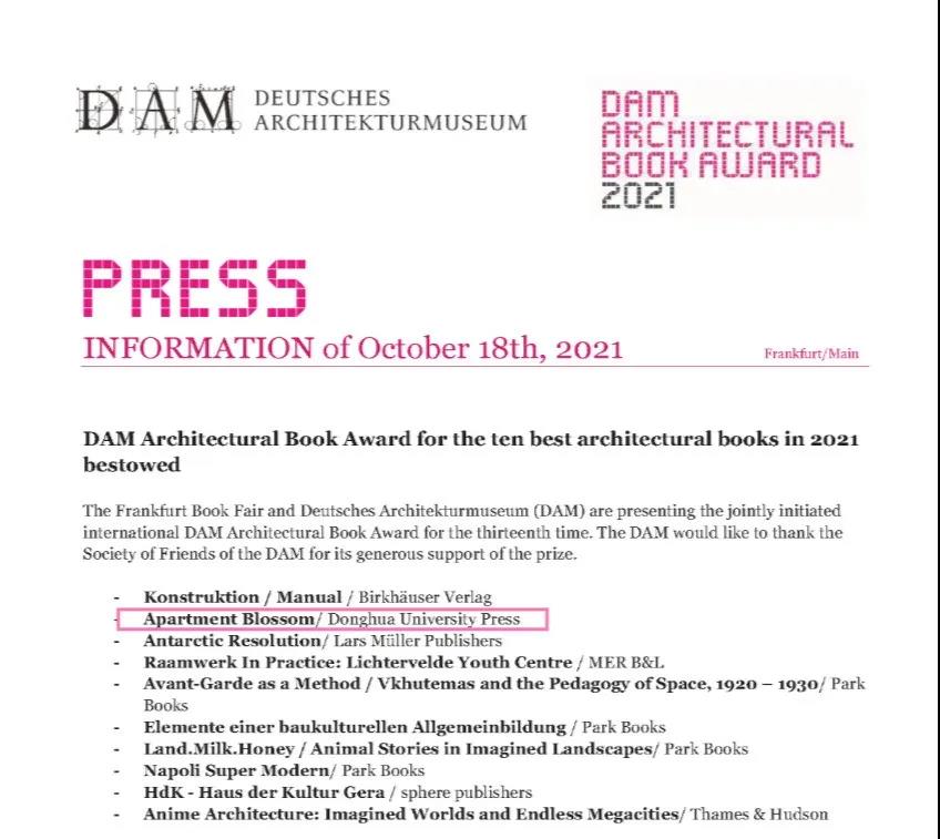 获奖名单由法兰克福书展(Frankfurt Book Fair)和德国建筑博物馆(DAM)公布