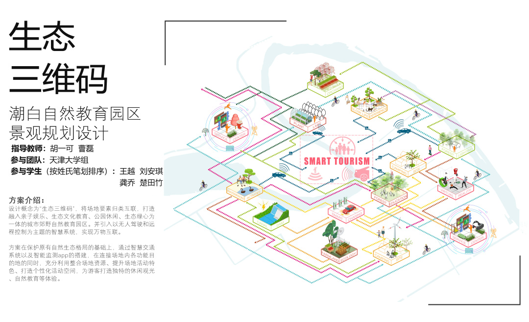 天津大学组《生态三维码》将场地要素归类互联,打造亲子娱乐、生态文化教育、公园休闲、生态绿心为一体的城市郊野自然教育园区。并引入以无人驾驶和远程控制为依托的智慧系统,实现万物互联。方案在保护原有自然生态格局的基础上,通过智慧交通和智能监测系统的搭建,在连接场地内各目的地的同时,充分利用并整合场地资源、提升场地特色、打造个性化活动空间,为游客提供独特的休闲游憩、旅游观光、自然教育体验。