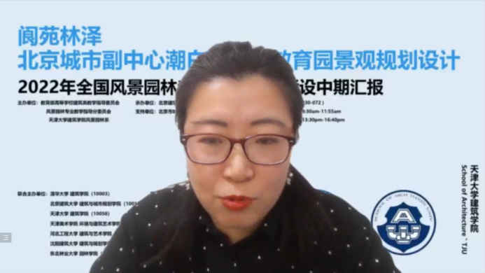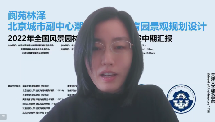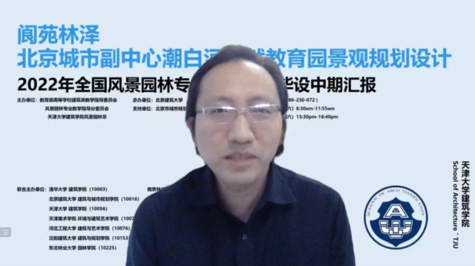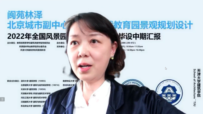● 天津大学努努影视 风景园林系副主任胡一可教授热烈欢迎各高校参与由天津大学努努影视 主办的“2022年全国风景园林专业10+高校联合毕业设计”中期汇报,并简要介绍了“2022年全国风景园林专业10+高校联合毕业设计”中期汇报的内容、会议流程、以及参与嘉宾和参与院校。