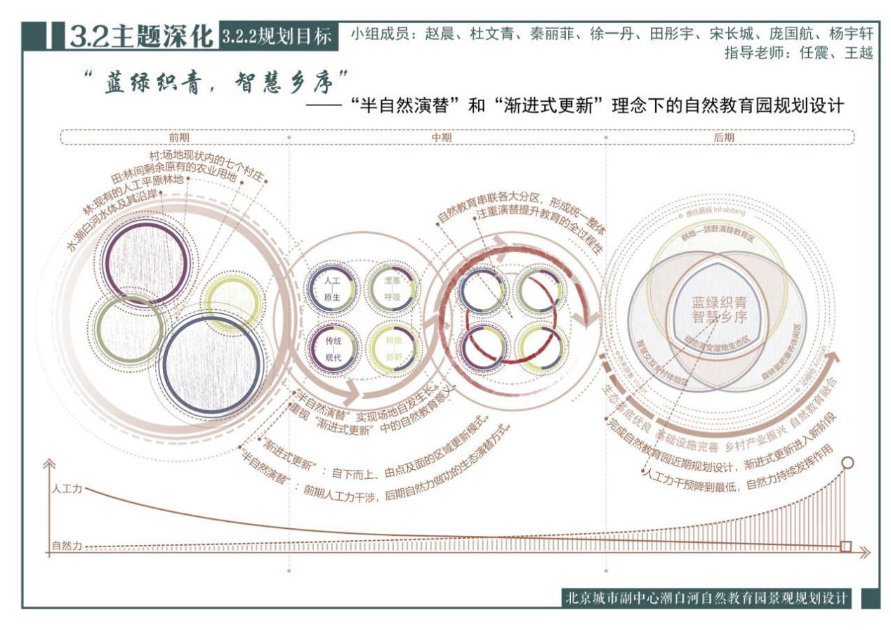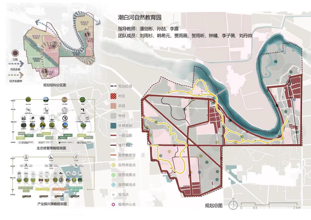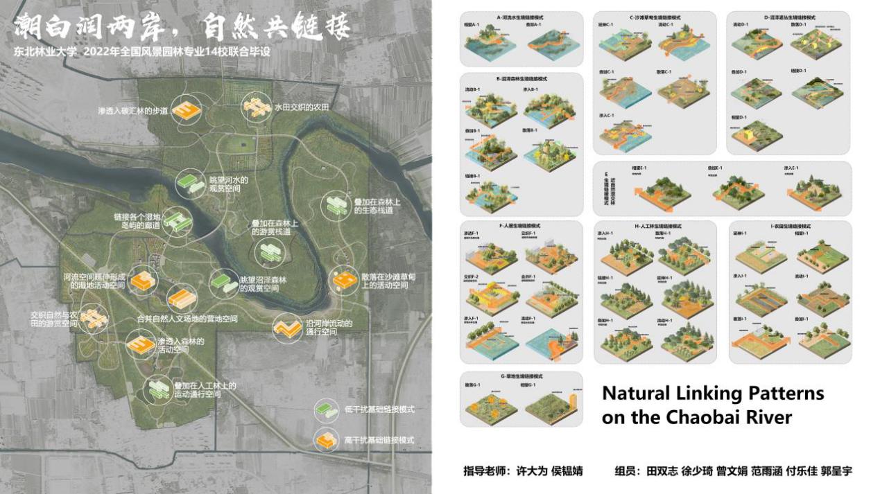 东北林业大学组《潮白润两岸,自然共链接》以“潮白润两岸,自然共链接”为规划设计理念,针对“水生态安全、自然生态、自然链接与游览体验”四个场地核心议题,分别提出海绵韧性化、生态自然化、自然体验化与游览智慧化四大核心策略,构建了将人与自然连接的链接模式库,以期提升场地生态服务价值,增强生境中自然教育的体验感。